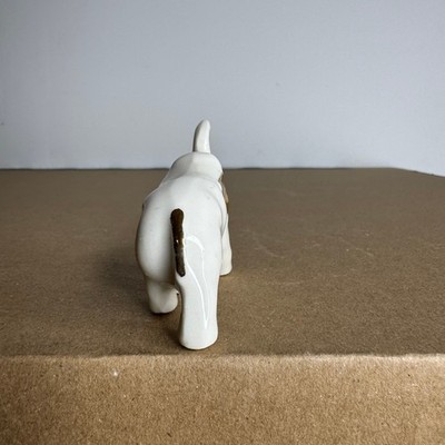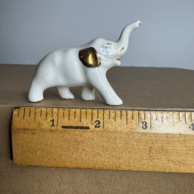 Keywords: vintage ceramic elephant, white elephant figurine, gold accent elephant, tiny animal statue, desk decor, shelf decor, collectible elephant, lucky elephant, home accent, gift for elephant lover, cute animal figurine, retro decor, small ceramic animal
