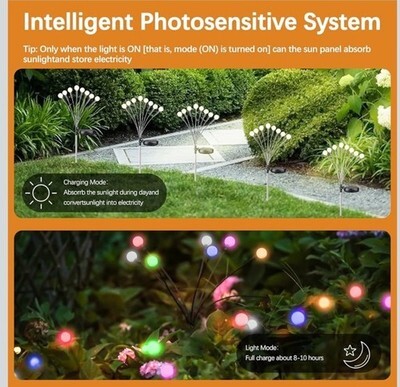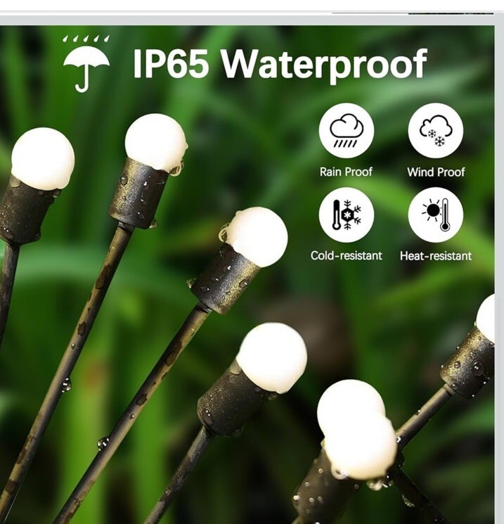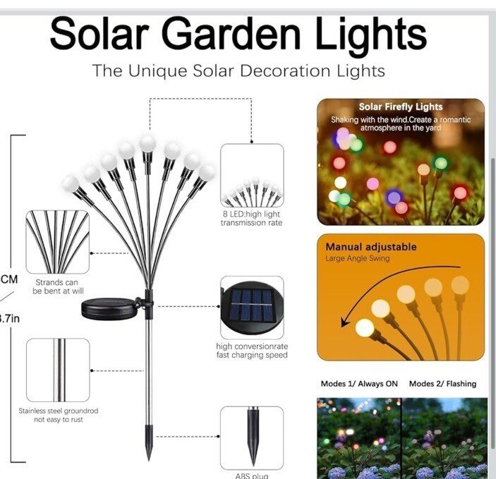 The 4Pcs Solar Firefly Lights 32 LED Solar Garden Lights are a perfect addition to any outdoor space. With a warm white light color and 8 different settings, these lights create a cozy and festive ambiance. Powered by solar energy, these lights are not only eco-friendly but also convenient to install. The waterproof feature ensures durability and reliability in various weather conditions, making them a great choice for year-round use. Whether for holidays or everyday illumination, these solar garden lights are sure to enhance the beauty of your outdoor environment.