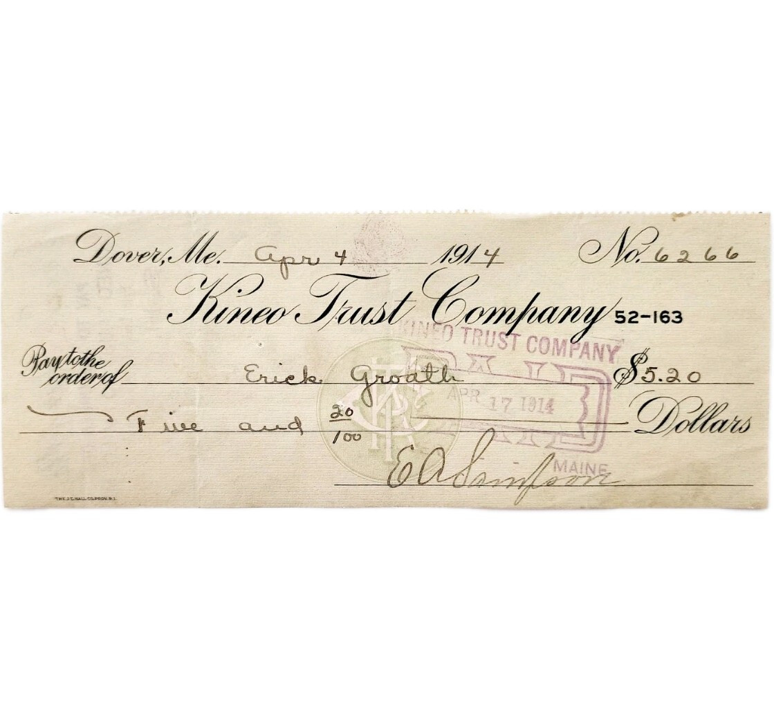 1914 Kineo Trust Company Bank Check E.A. Sampson Dover Maine Signed 6266 CHX12