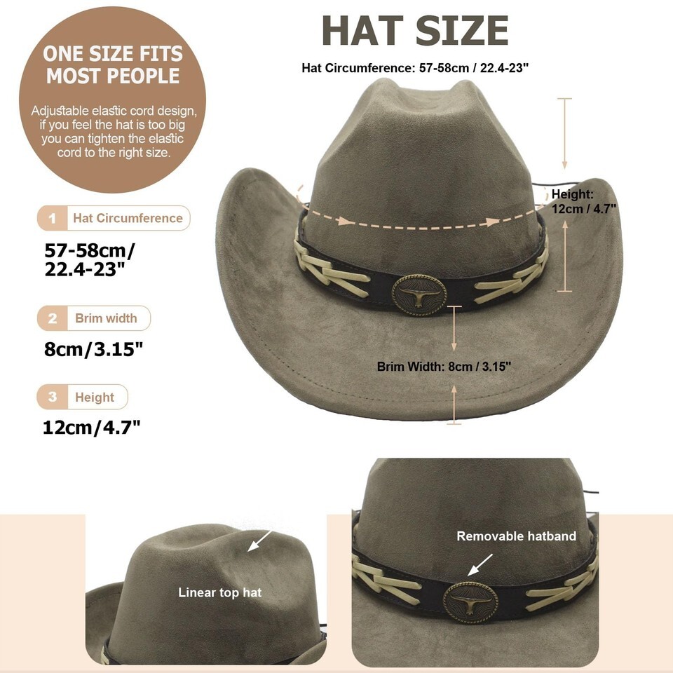 Cowboy hat adjustable size: Suede cowboy hat circumference :57-58 cm /22 "-23"; Edge width :8 cm /3.15 "; Cap height :12 cm /4.72 inches, you can adjust the cap to your best size with adjustable straps based on your head circumference.