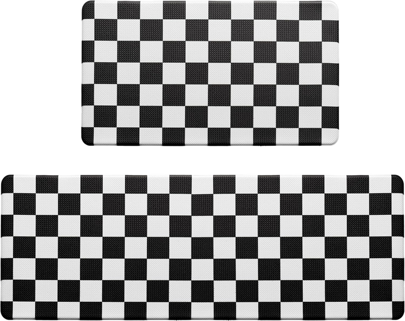 Black Checkered Grid Checkerboard Kitchen Rug Sets [2 Pcs], Anti-Fatigue, Waterproof Non-Slip Kitchen Mats Heavy Duty Ergonomic Comfort Foam Rug for Floor, Home, Laundry,17"X29"+17"X47"
