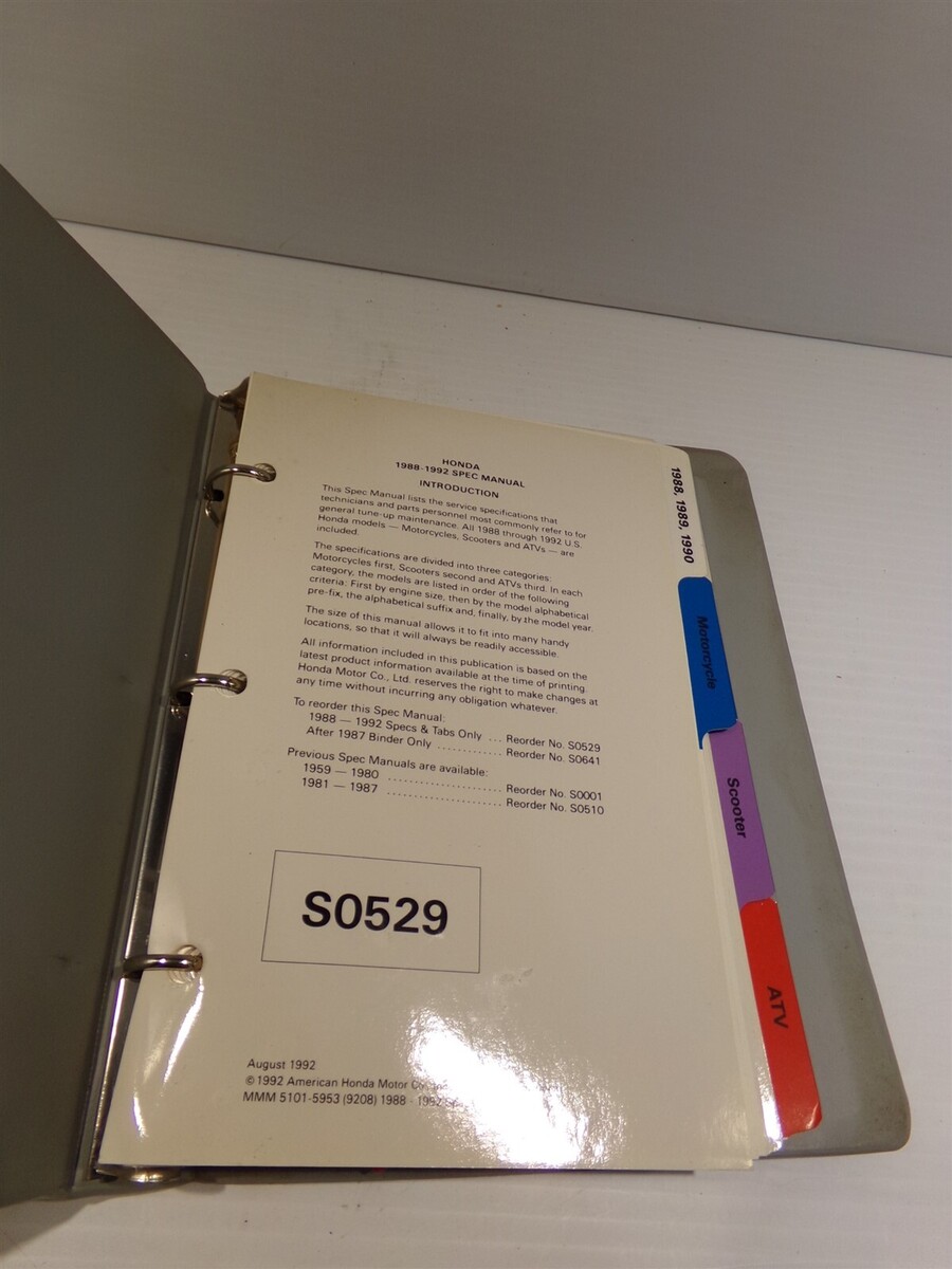 Honda Spec Manual 1988 1989 1990 1991 1992 Motorcycle Scooter ATV SO529