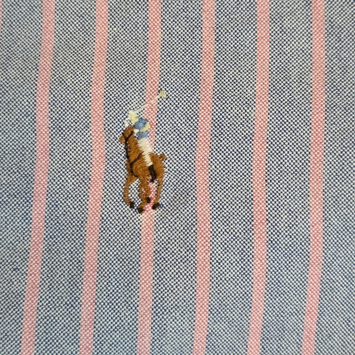 Classic Ralph Lauren striped button-down shirt in a soft purple tone with pink vertical stripes and signature embroidered pony logo. Light wear with a few small fabric pulls on the back (see photos). Clean, crisp cotton and a great versatile colorway.