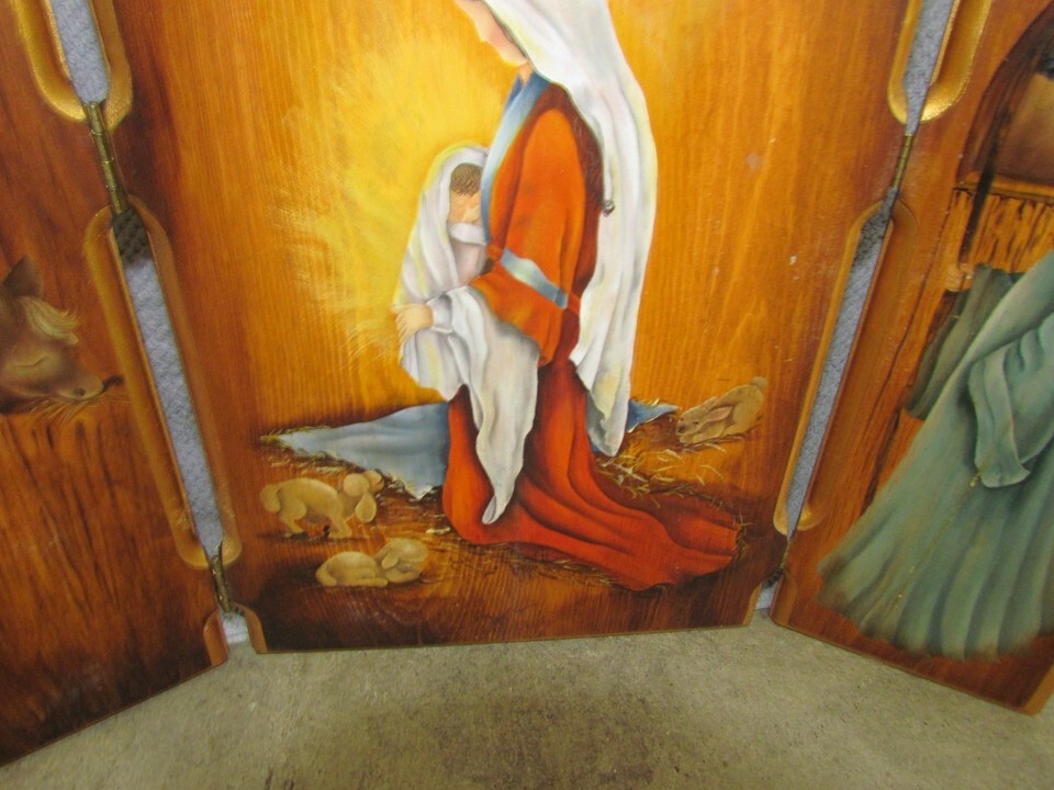 Vintage Handpainted Folk Art Christmas Wooden Religious Triptych Nativity Scene