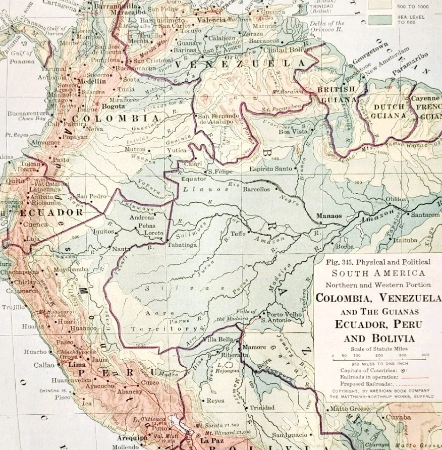 1916 Map South America Political Physical Colombia Venezuela Peru Bolivia DWSS8