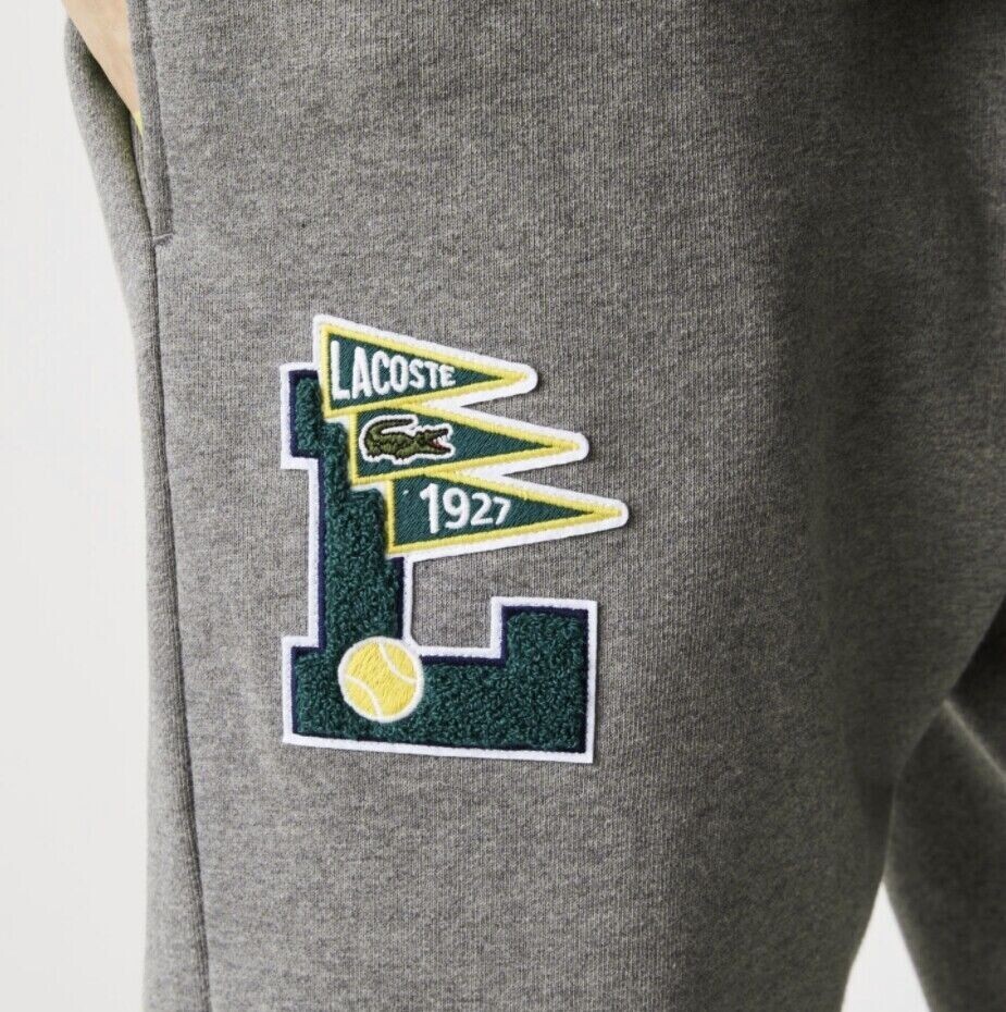 The product is a pair of Lacoste men's Pennants Badge fleece pants in grey chine, size 4XL. These athletic fit sweatpants feature a pull-on closure, elastic waist, and are made of 100% cotton fleece fabric. Perfect for activewear, these straight-leg pants are ideal for various sports activities and outdoor adventures during the winter, fall, and spring seasons. The stylish design and quality construction of these Lacoste pants make them a versatile and comfortable option for men's casual wear.