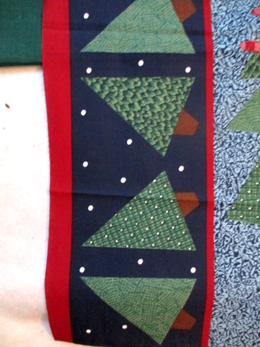 This fabric listing is by Hoffman California Fabrics that is a panel with a very large snowman in the center and to the right of him is his brown sled on mattress ticking. Bordered on 3 sides by dark green trees, this is in dark country colors of maroon, blue and green. It measures 34" x 22-1/2. The edges were cut uneven (not by me) but there is room for a border all around.