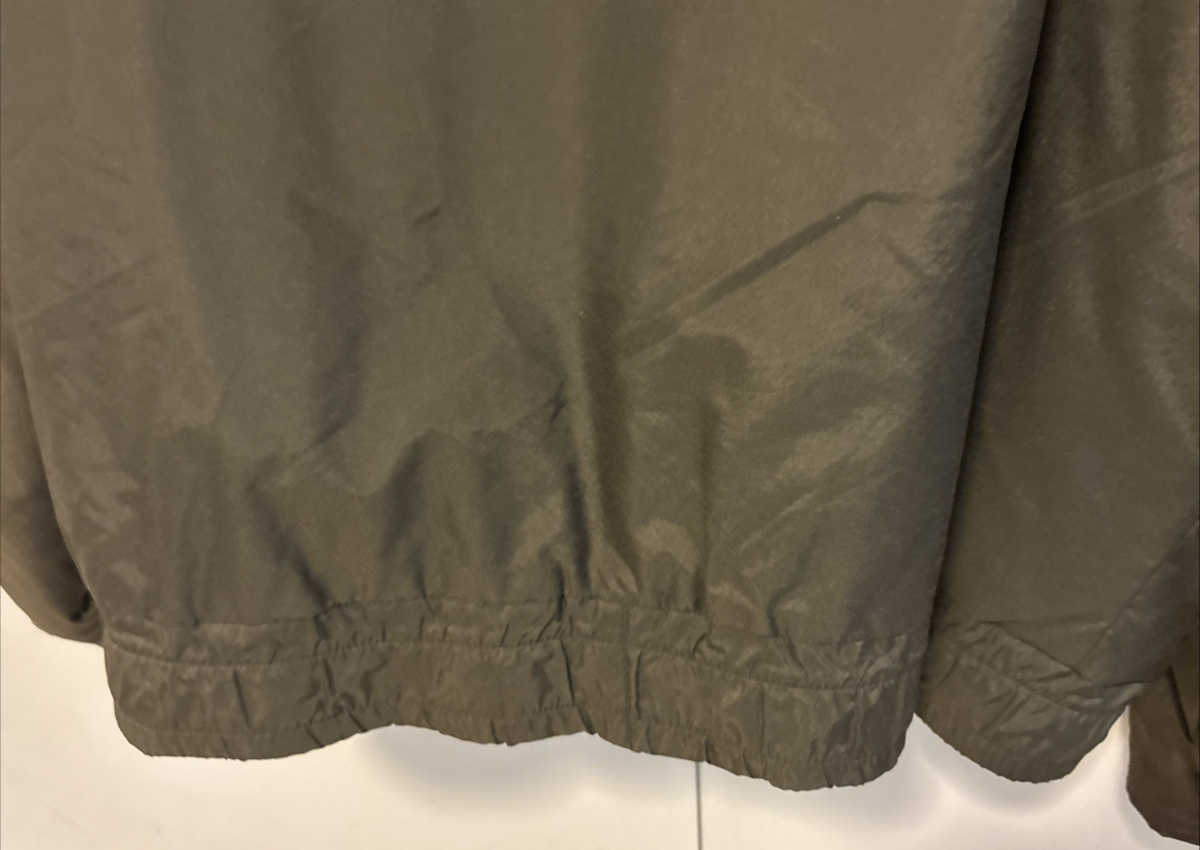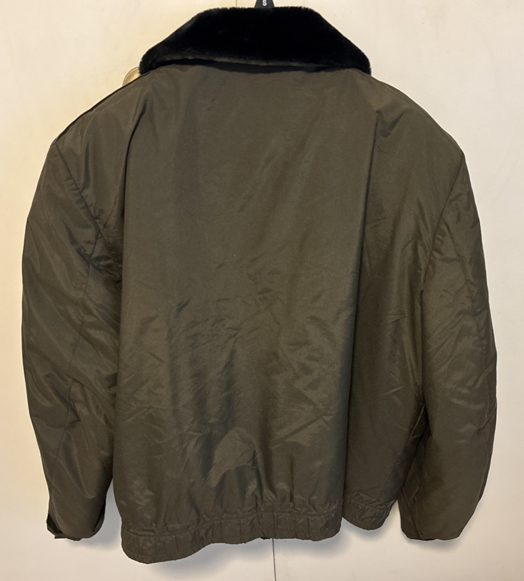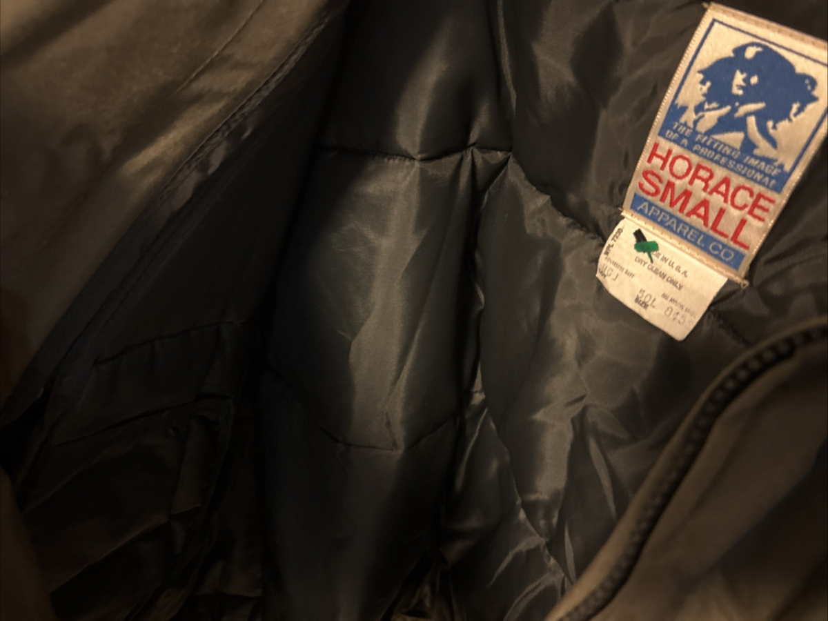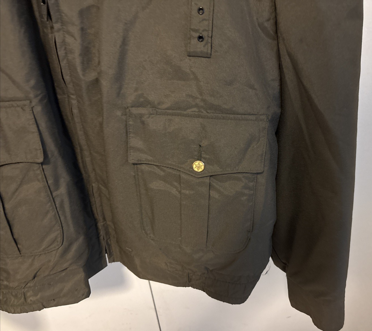 The product is an 80s vintage Horace Small Sheriff uniform jacket in size 50L. Made of nylon with a polyester lining, this short-length jacket features a solid green color, zip and button closure, and a collared design. The jacket is lined, making it suitable for the winter and fall seasons, and is designed for casual wear. With a military style and a theme of 80s, this jacket is a unique and stylish addition to any man's wardrobe.