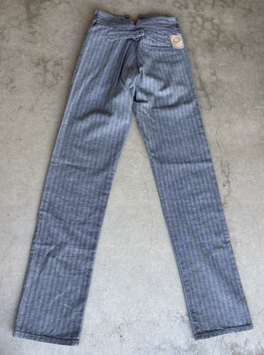 The WAH MAKER FRONTIER 100% Wool Western Pants are a vintage piece with a high-rise and a button closure, perfect for casual occasions. Made of wool with a striped pattern, these pants have a 36-inch inseam and a straight leg style. The 5-pocket design and slash pockets add functionality, while the multicolor palette and Western theme give them a classic and unique look. Made in the USA by WAH MAKER, these pants offer a comfortable regular fit for men looking to add a touch of American heritage to their wardrobe.