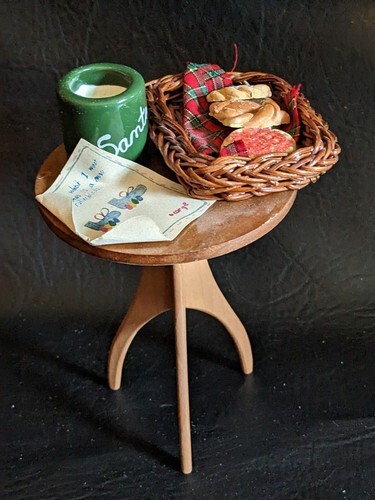 Up for sale is a used 2009 Byers Choice Round Side Table With Sweets Gingerbread Santa Mug Letter.