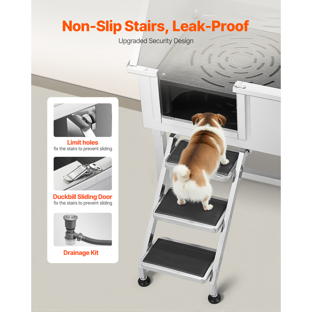 Anti-Slip and Leak-Proof: The upgraded sealing system and anti-slip stairs with limit holes ensure stability, avoiding wobbling and slipping when pets enter and exit. The drainage kit keeps smells at bay, ensuring a reliable experience during bath time