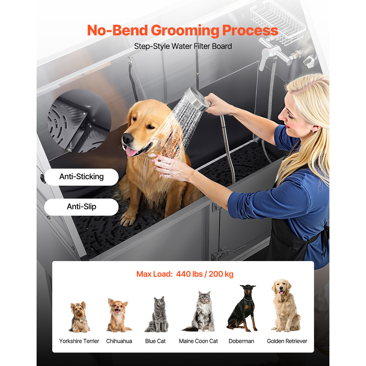 Upgraded Water Filter Board: The non-slip textured water filter board stops paws from getting stuck, making the bath more secure. With a weight capacity of 440 lbs / 200 kg, it is stable and reliable, allowing pets from small to medium-large sizes to relax comfortably during the bath