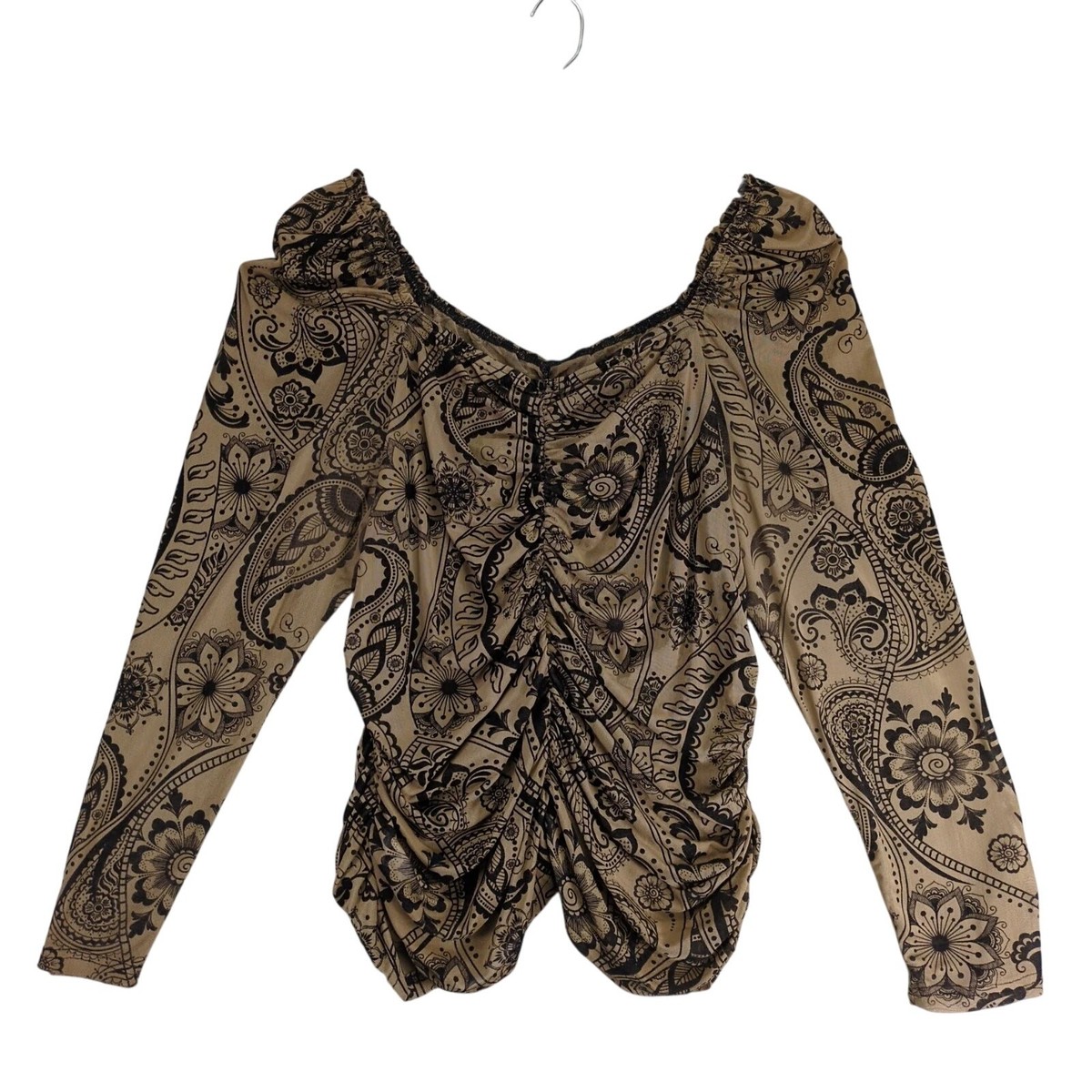 Features: Slim Fit, Long Sleeve, Off the Shoulder, Easy Care, Stretch, Sheer, Ruched, Paisley Pattern, Pullover Closure, Velvet Trim, Basic Style, Machine Washable