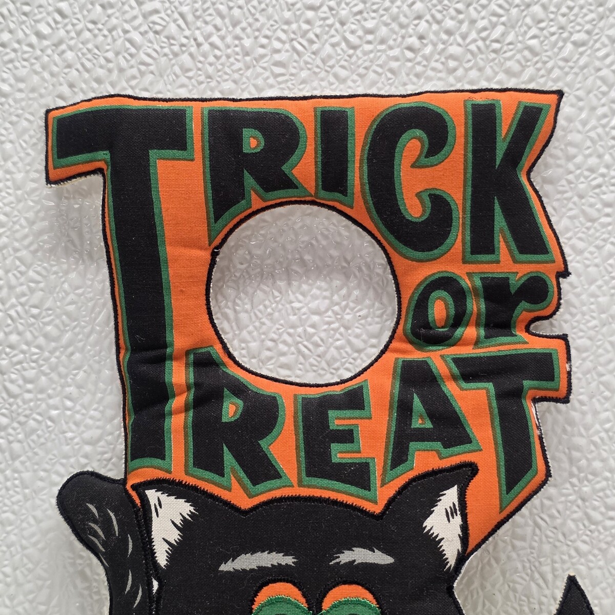 Vintage Halloween Black Cat And Pumpkin TRICK OR TREAT Fabric Door Knob Hanger. Images show actual item that will ship.