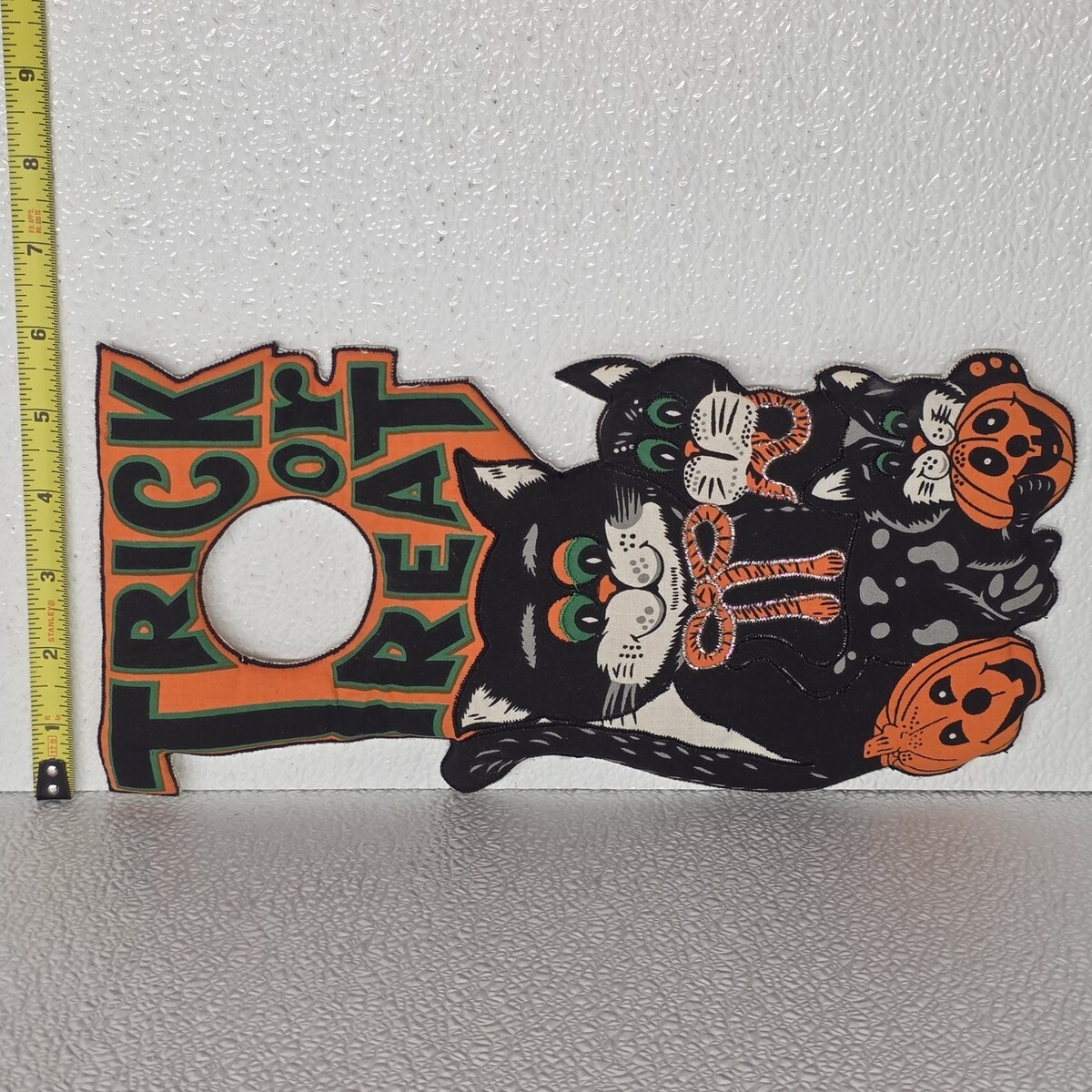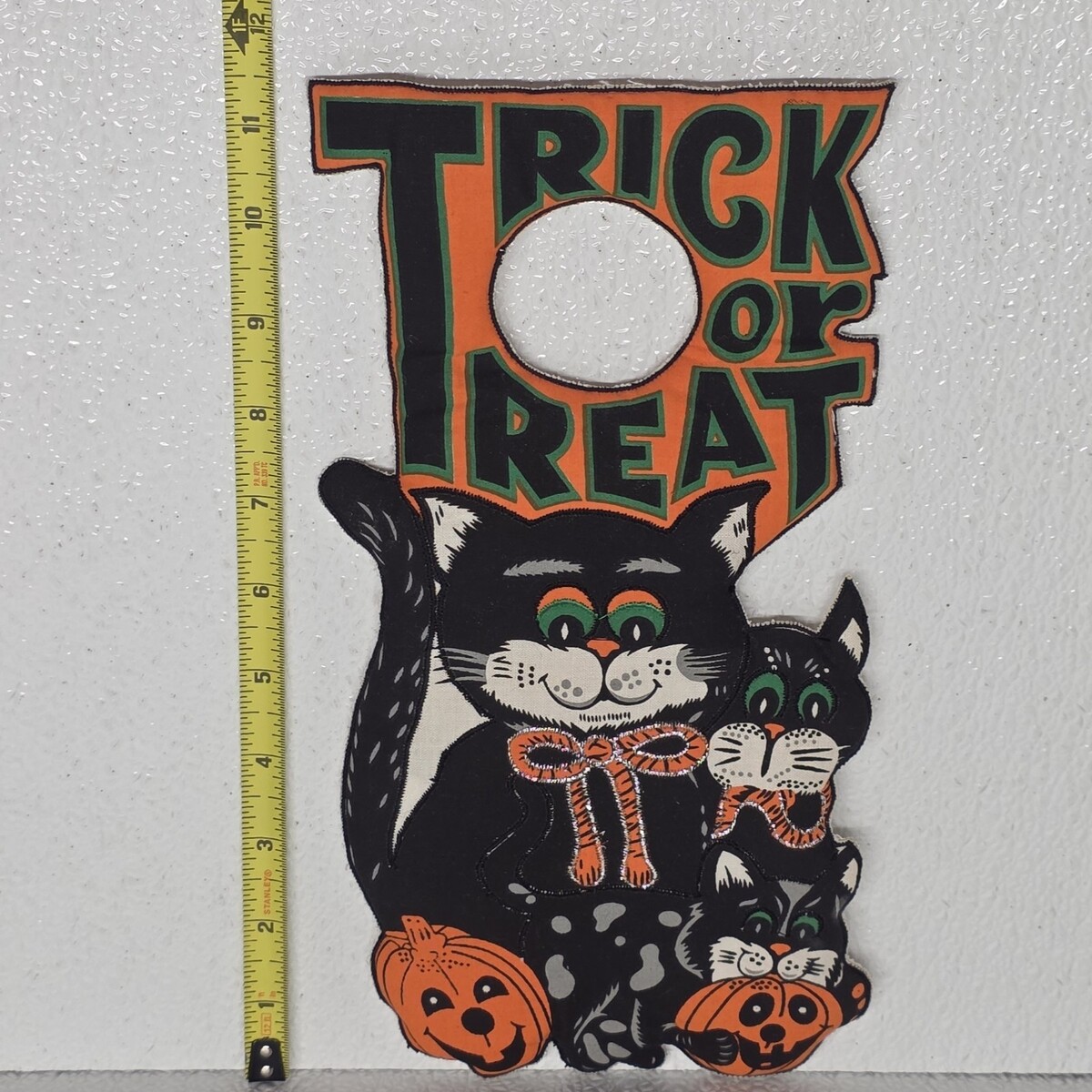 Vintage Halloween Black Cat And Pumpkin TRICK OR TREAT Fabric Door Knob Hanger