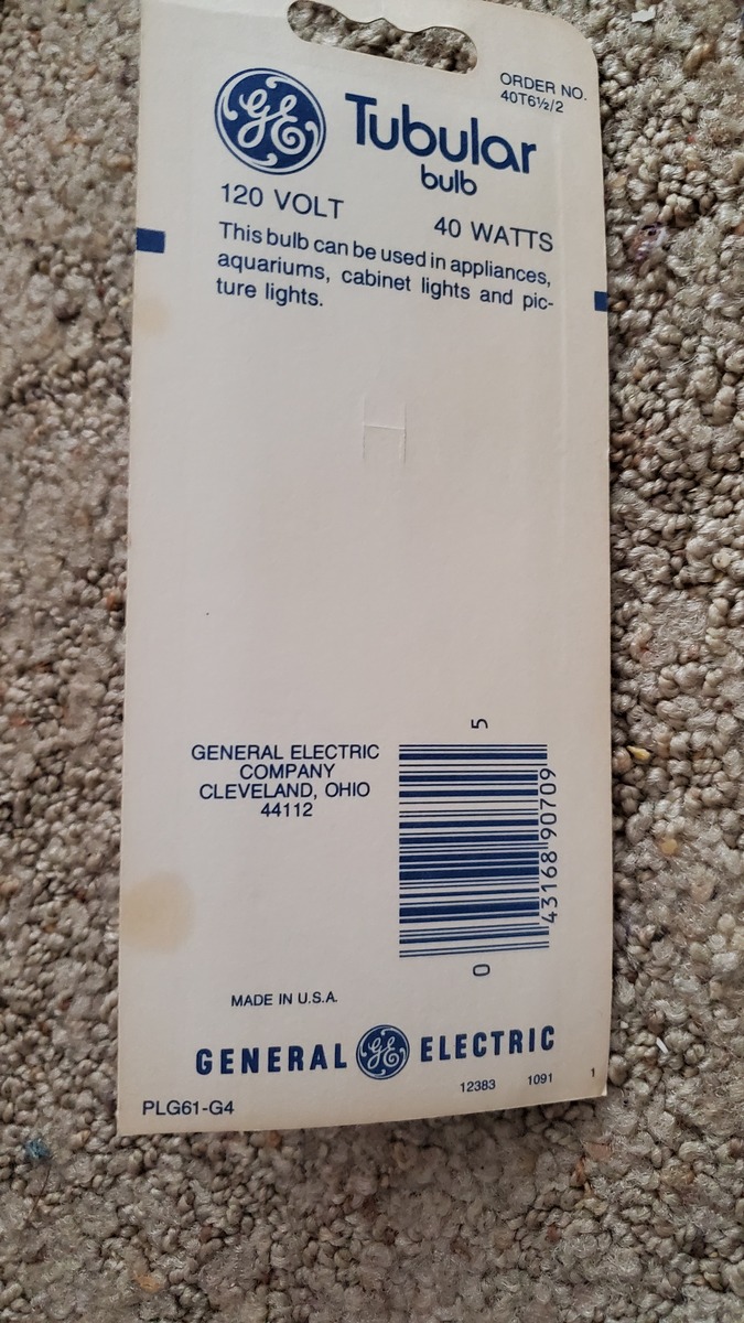 New never opened package with a GE 40 Watt Tubular light bulb, T6.5.