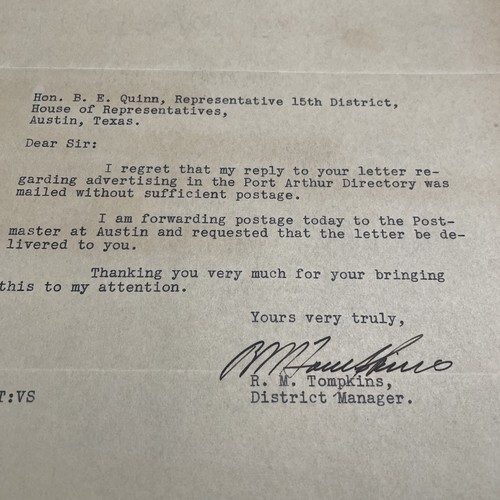 Written to the Texas State Representative from the Beaumont Texas area B. E. Quinn