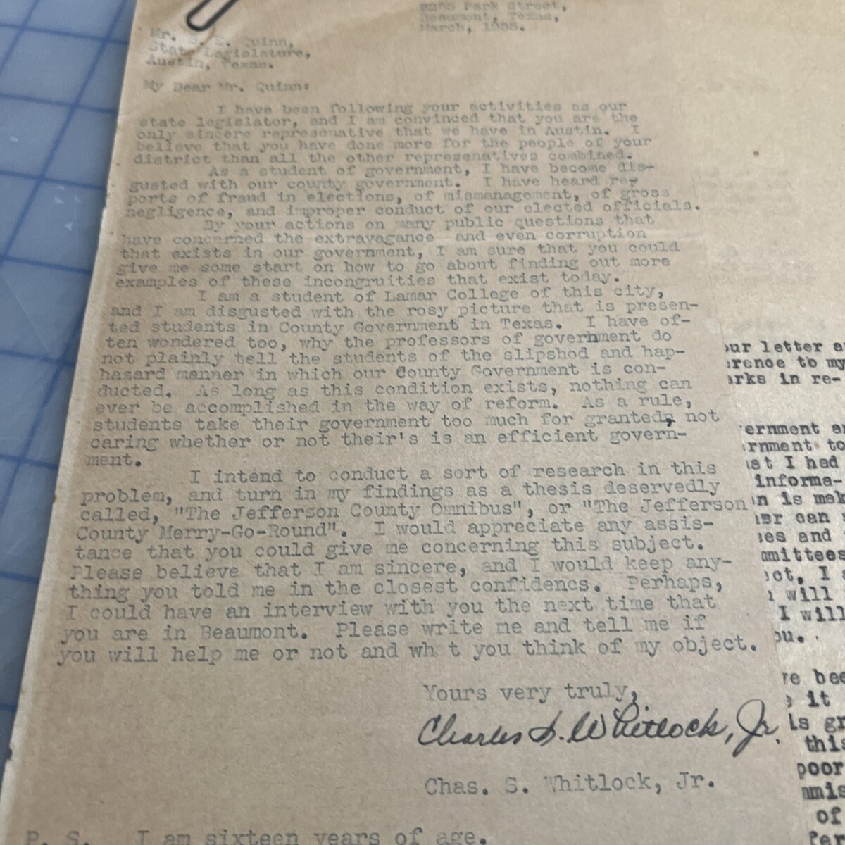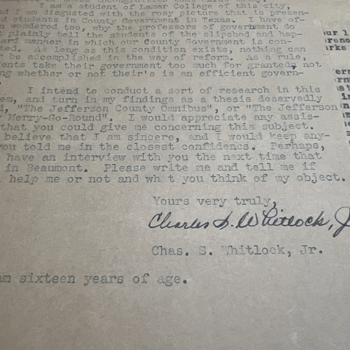 Letter from a 16 year old complaining to his Texas State representative from the Beaumont area about the local government in the area.