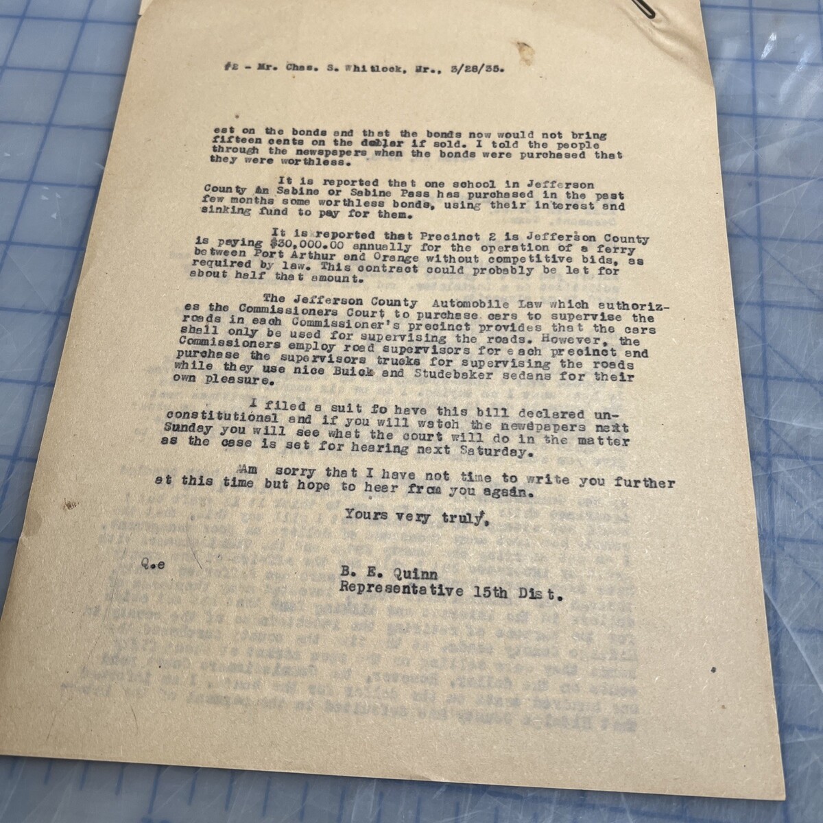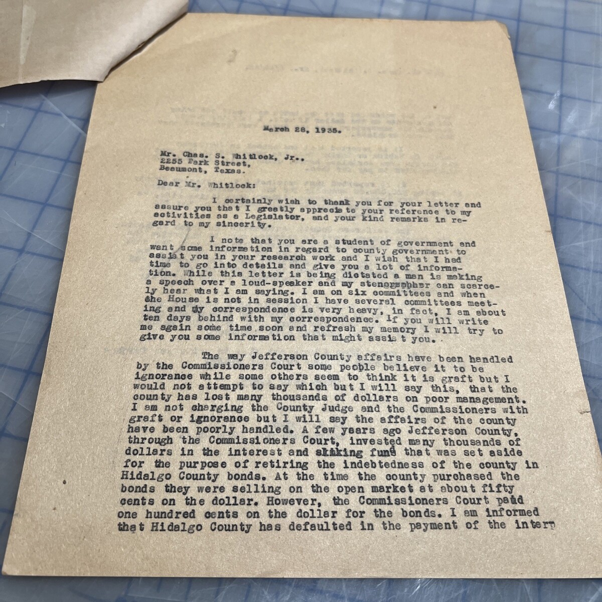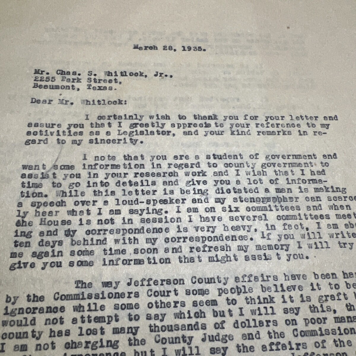Political Letter Beaumont Texas Jefferson County Letter complaint Response 1935