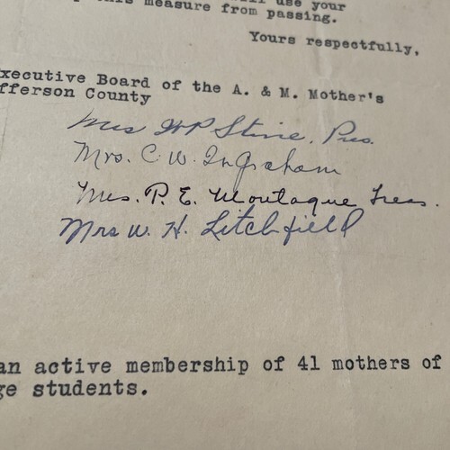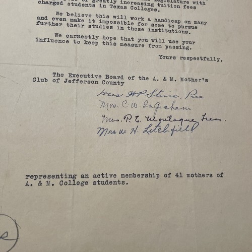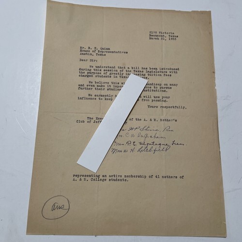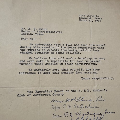 Texas A M Mother?s Club Of Jefferson county letter 1935 To State Representative.