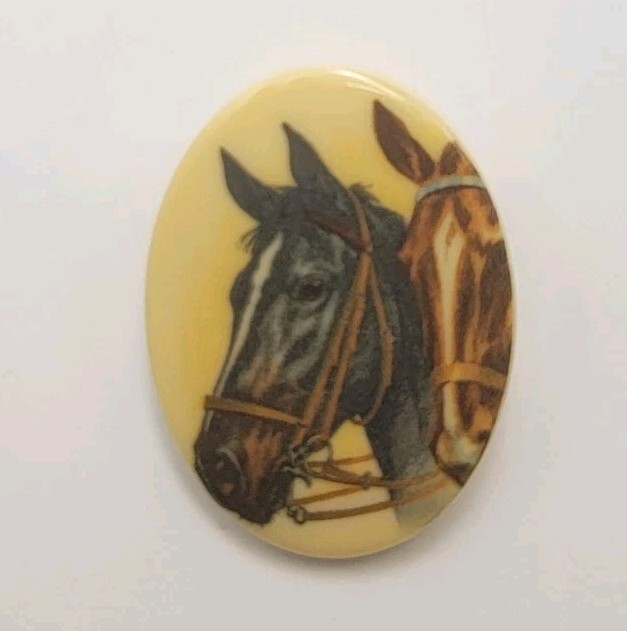 Vintage Horse Portrait Pin Two Horses Oval Plastic Brooch Equestrian Animal