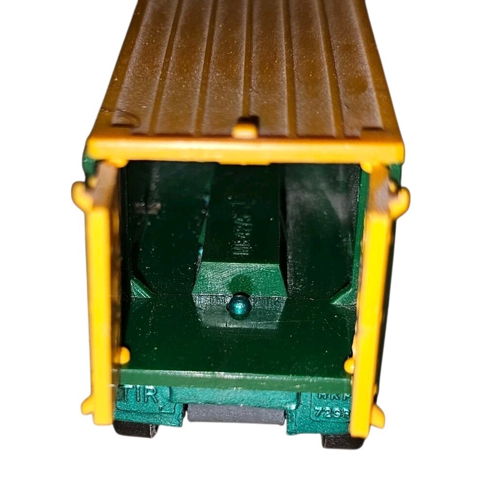 The Matchbox Superfast No 42 Mercedes Container Truck in Mayflower Blue with blue windows is a vintage diecast toy vehicle made in the United Kingdom. This 1:64 scale model, produced in 1976, features original packaging and is part of the Superfast series. The metallic green colour and detailed design make it a collector's item for fans of classic cars and trucks from the 1970s.
