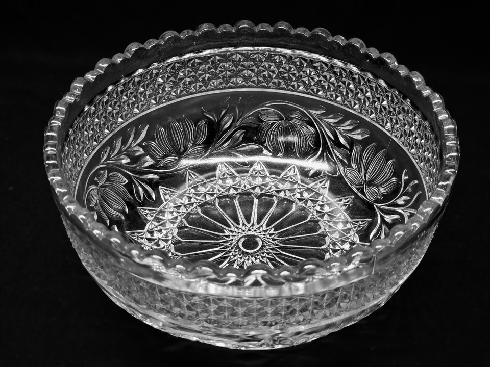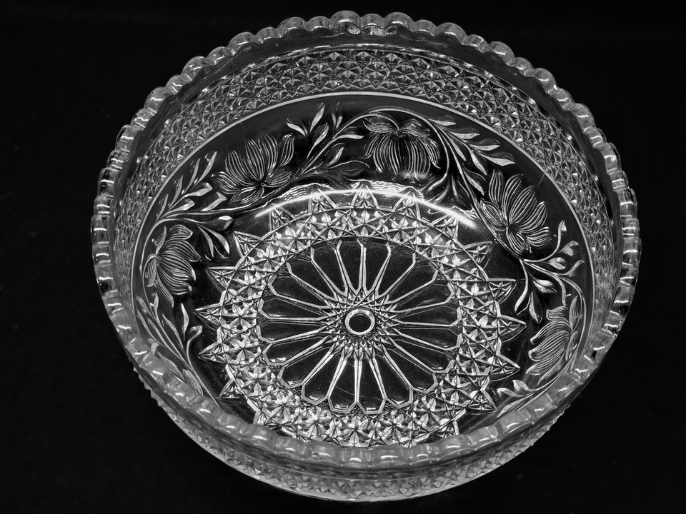Antique Rose Point Band serving bowl by Indiana Glass in excellent condition. Great clarity, no evidence of damage or wear. Bowl measures 8.75" in diameter. Great for serving all manner of foods and/or snacks. Circa 1913.