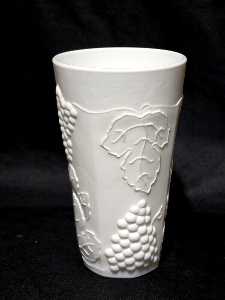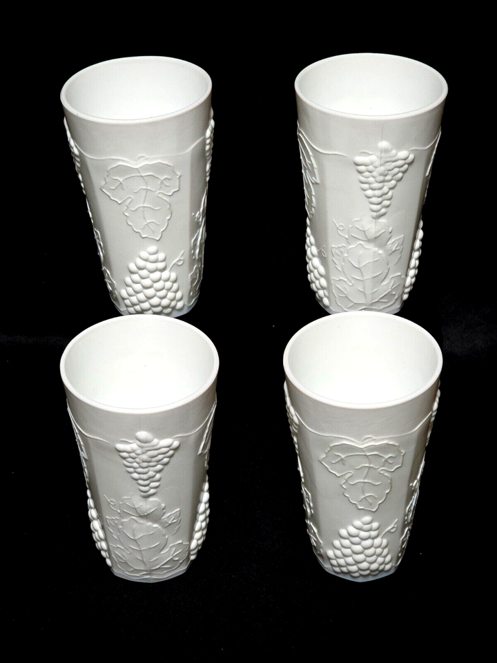 Beautiful set of 4 Indiana Glass Colony Harvest milk glass 5.75" coolers in near mint condition. No damage or wear on any of the glasses. Holds 16 ounces and is ideal for iced tea, soda or other favorite beverage.