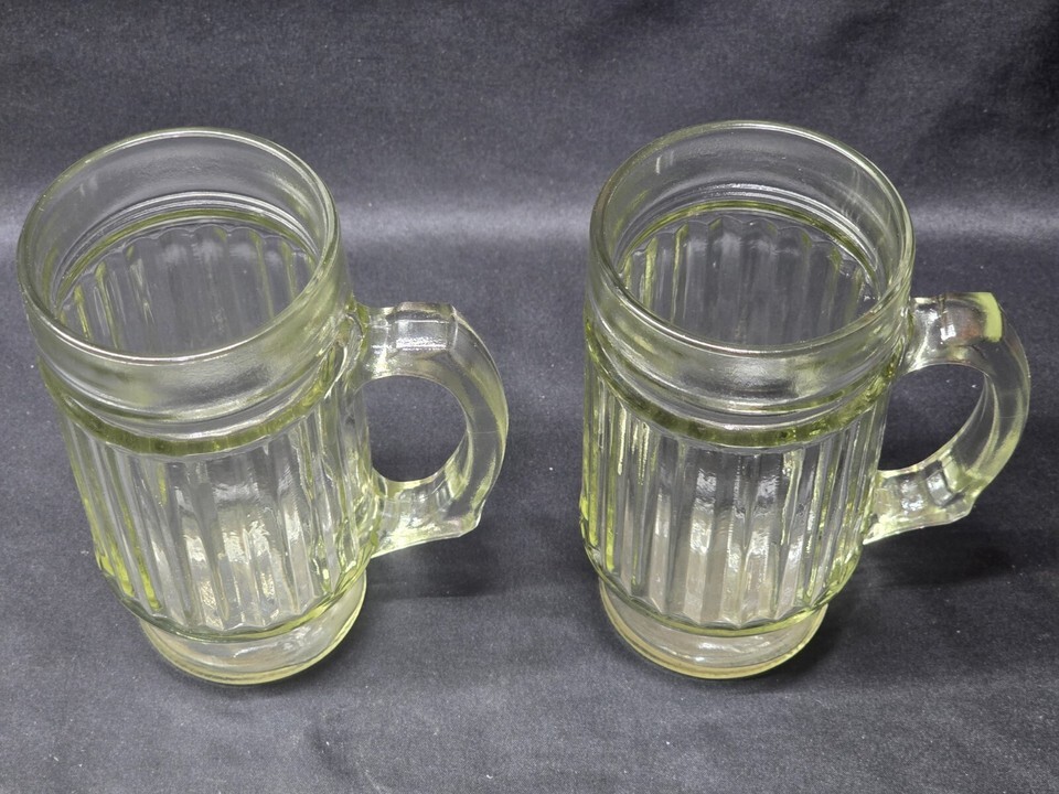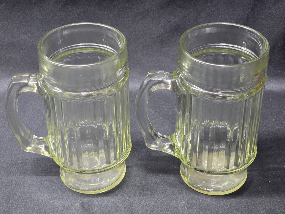 Pair of 2 ribbed 16-ounce glasses in excellent condition, no damage and very little wear, if any. Unbranded, but research turns up identical patterns for Hazel-Atlas and Macbeth-Evans...however, I cannot say which one they are.
