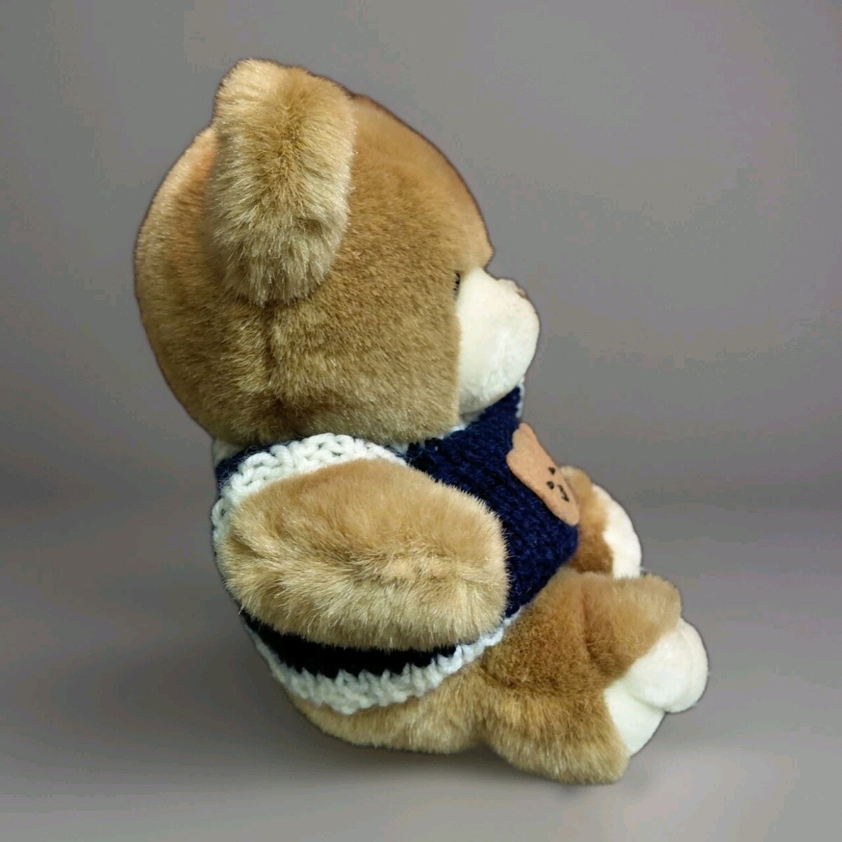 This small sized teddy bear comes wearing a sweater, adding a unique touch to its vintage appeal.