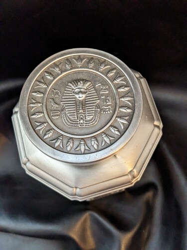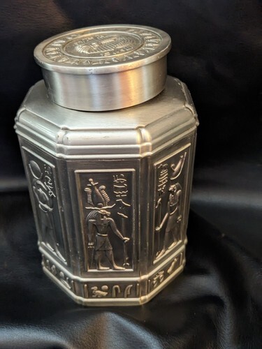 A vendre est une boîte a the en metal vintage egyptien Pharoh Ebros Sarcophagus d'occasion qui mesure 8 cotes et mesure 6 pouces de haut.
