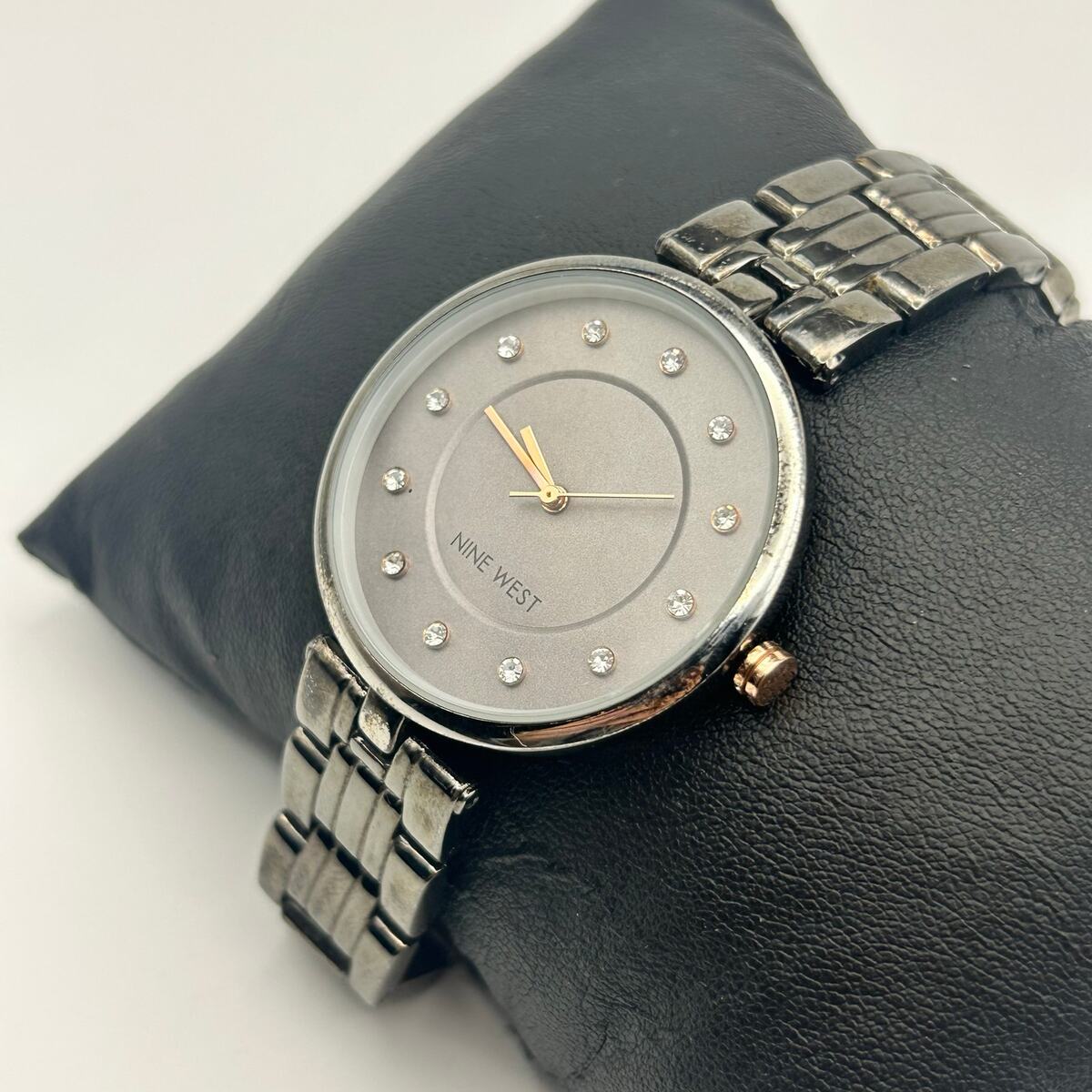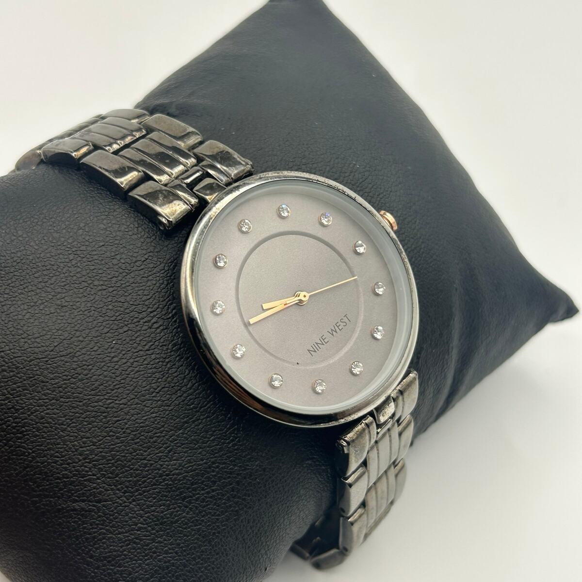 This elegant Nine West women's watch features a stunning metallic gray finish and a crystal-accented dial, adding a touch of sparkle to your wrist. It's in excellent working condition with a brand new battery, so you can wear it right away!