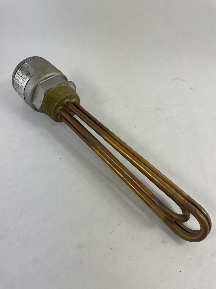 ---IMMERSION HEATER ---3 COPPER ELEMENTS / BRAZED TO PLUG ---2-1/2 INCH NPT / BRONZE SCREW PLUG ---6 KW ---3 PHASE ---480 V ---12 INCH ---STANDARD TERMINAL ENCLOSURE / ONE 3/4 INCH CONDUIT ---LESS / THERMOSTAT AND THERMOWELL ---HORIZONTAL INSTALL 4-6 INCH FROM BASE OF TANK