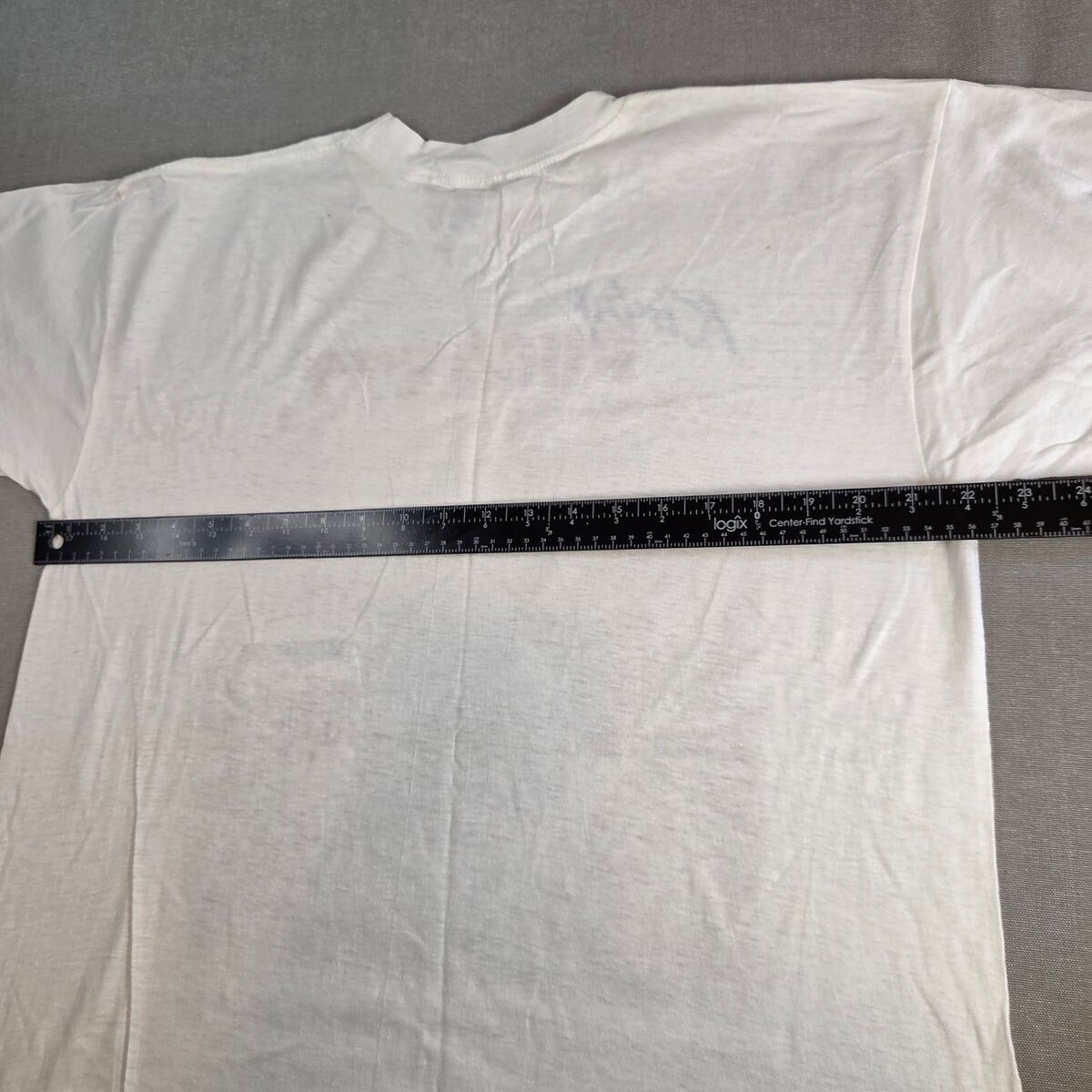Condition: Good vintage ? clean overall, some small discoloration/spots typical for white cotton, no holes or major damage visible. Print is intact; tag in decent condition.