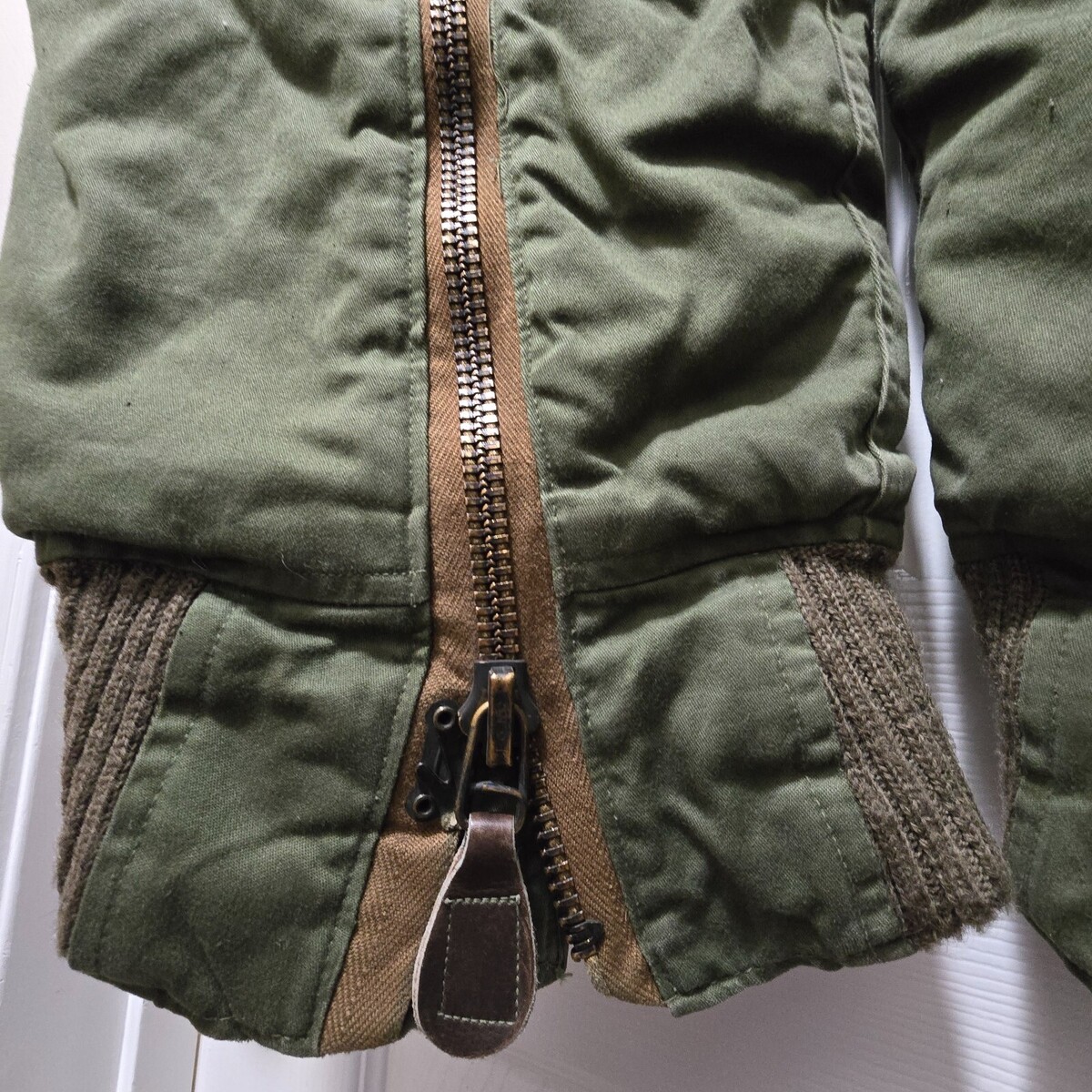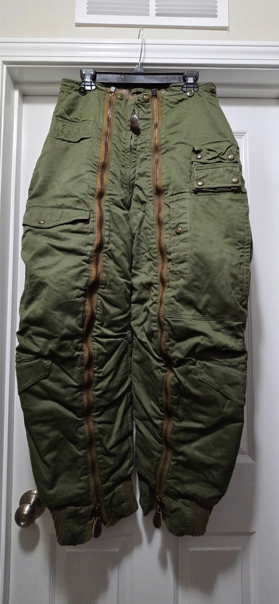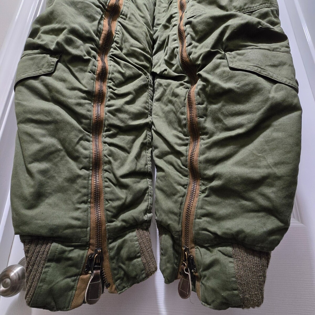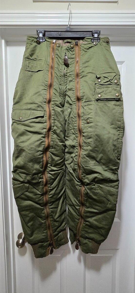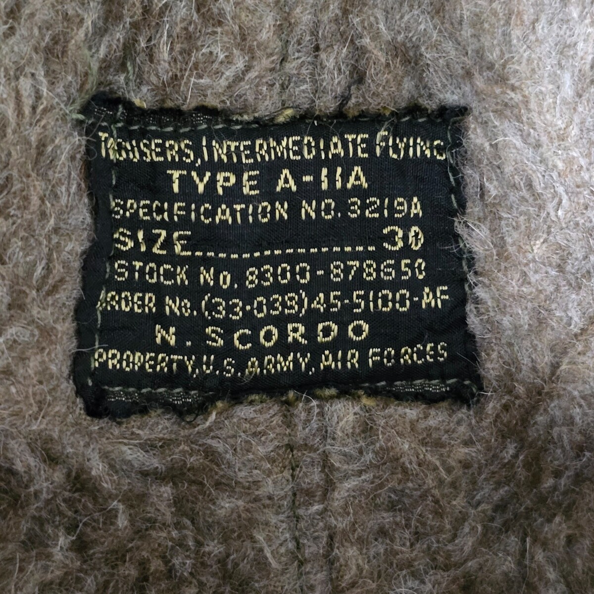 Vintage N. Scordo US Army Air Force WWII Alpaca Fur Lined Type A-11A Intermediate Flying Green Trousers. They have "AGS134" on the back of the leg. Men's Tag Size 30. Actual measurements: 31" waist, 31" inseam. These are extremely durable, heavyweight pants. Back when things were made of quality.