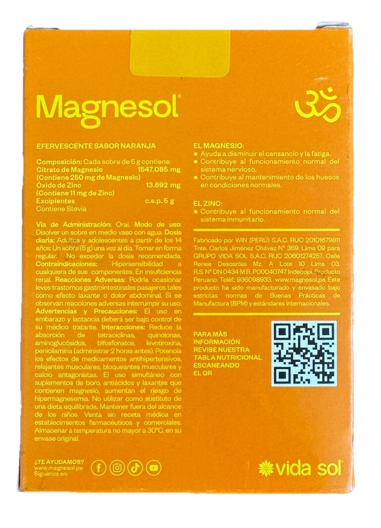 Magnesol Suplemento Nutritional Magnesia Zinc sabor naranja 33 sobres x caja