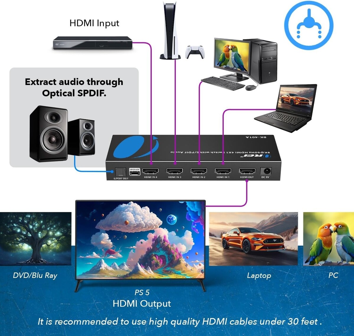 8K HDMI 4 input into 1 output Switcher with Audio Extractor through Optical SPDIF. This Device will not extract Audio through HDMI.