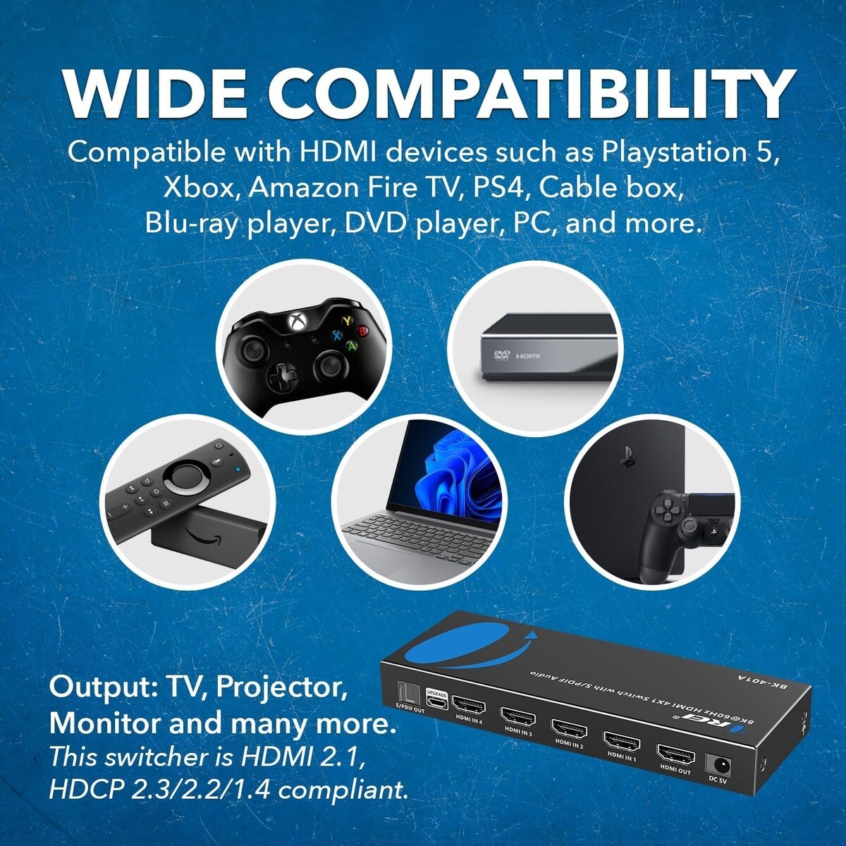 8K Switcher Selector is compatible with all operating system such as Windows, Mac OS, Linux. Also works perfectly with Logitech Harmony, Xbox, one X, PS5 , Roku 4, Amazon Fire TV, Blu-ray players, Projector etc. Does NOT support Sonos-ARC/e-ARC.