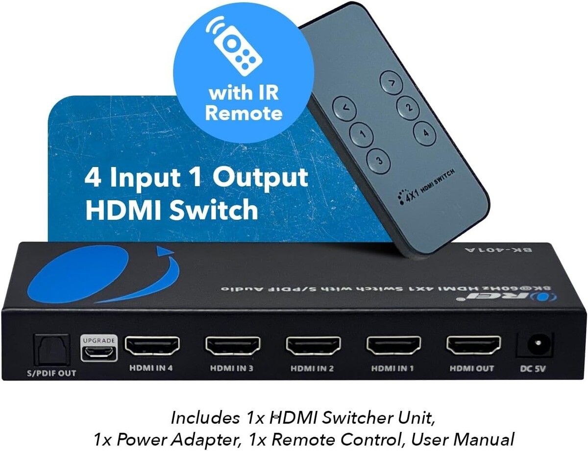 Includes - 4x1 8K Switcher, Power Adapter, IR Remote Control, Operation Manual.