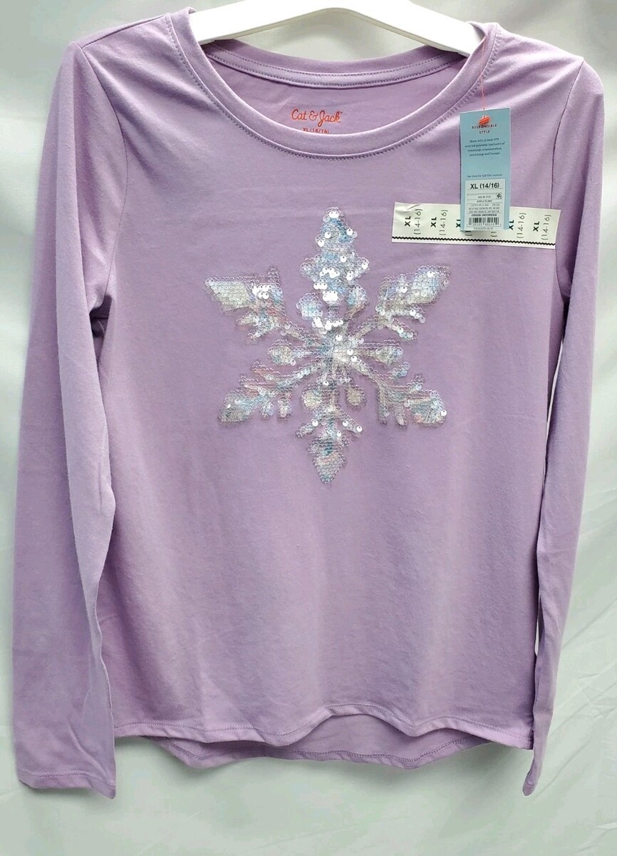 The Cat Jack Girls' XL (14-16) Long Sleeve Flip Snowflake ?? Sequin T-Shirt in Violet Purple is a stylish and comfortable top perfect for the winter season. Made from a blend of polyester and cotton, the shirt features a solid pattern with long sleeves and a round neckline for easy wear. The pullover style with sequin accents adds a touch of flair, while the machine washable fabric ensures easy care. With a regular fit and size XL, this t-shirt is suitable for girls engaging in activities like walking or school during the fall and winter months.