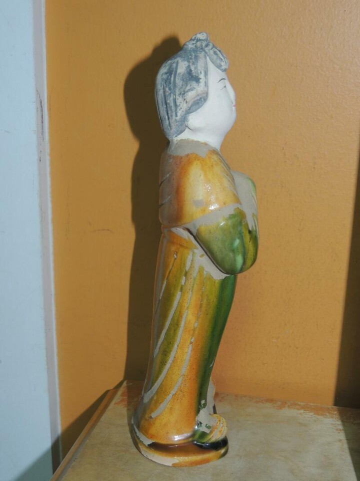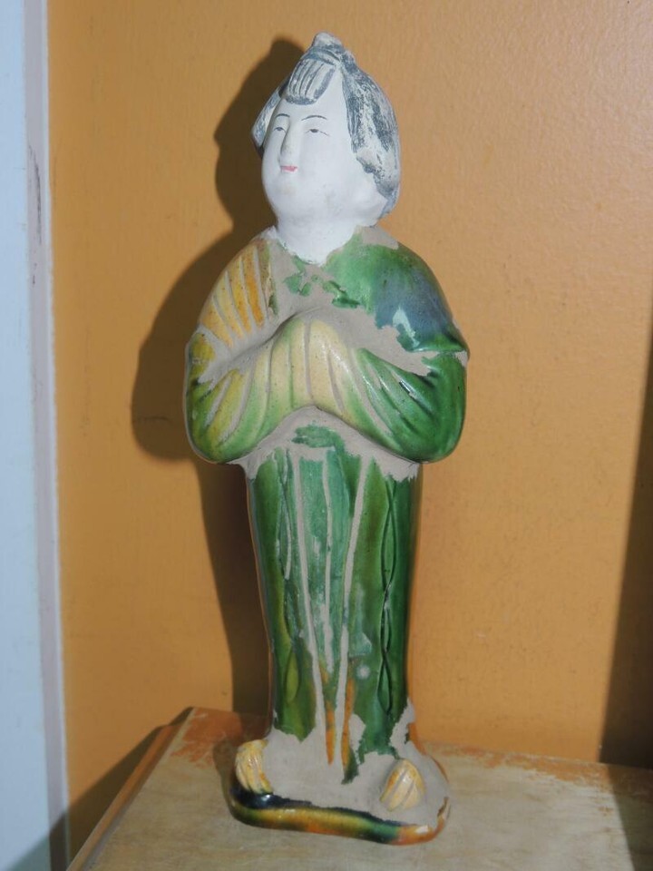 Chinese Terracotta Mud Woman Standing 8.5" Sancai drip glaze yellow green mudman