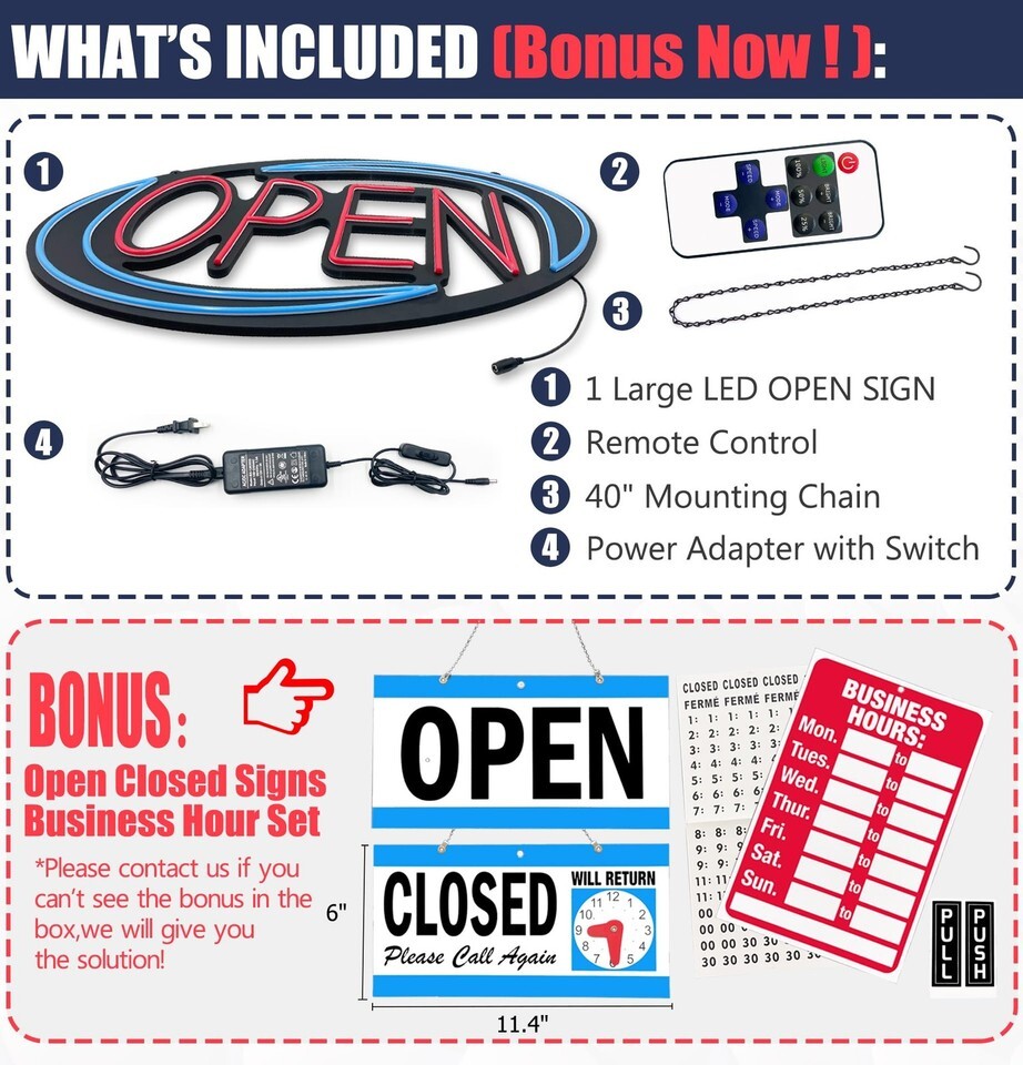 WHAT?S INCLUDED BOUNS:A Bright Large LED OPEN SIGN (Item Dimensions LxW 32"x 16"),1 Remote Control,1 AC/DC Power Adapter with ON/OFF Switch,1 Mounting Chain,SPECILA BOUNS(Open Closed with Business Hour Sign PVC Set)