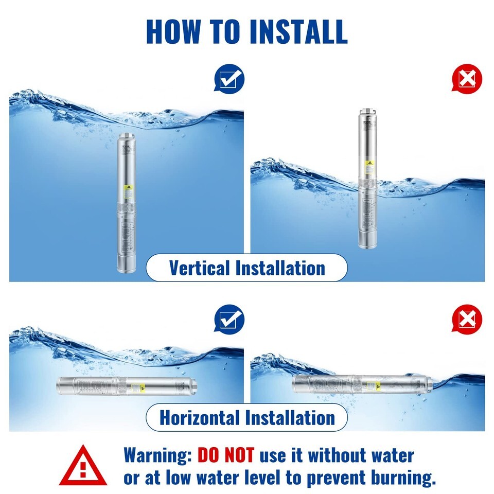 Reliable Copper Motor: Are you tired of previous submersible well pumps failing you? Are you ready for consistent satisfaction and quality? The powerful copper motor and high-precision rotor promise long-term stable running. The motor features built-in overload protection, allowing it to automatically stop when stuck or during abnormal situations to prevent burning. NOTICE: DO NOT use it without water or at a low water level to avoid idle running.