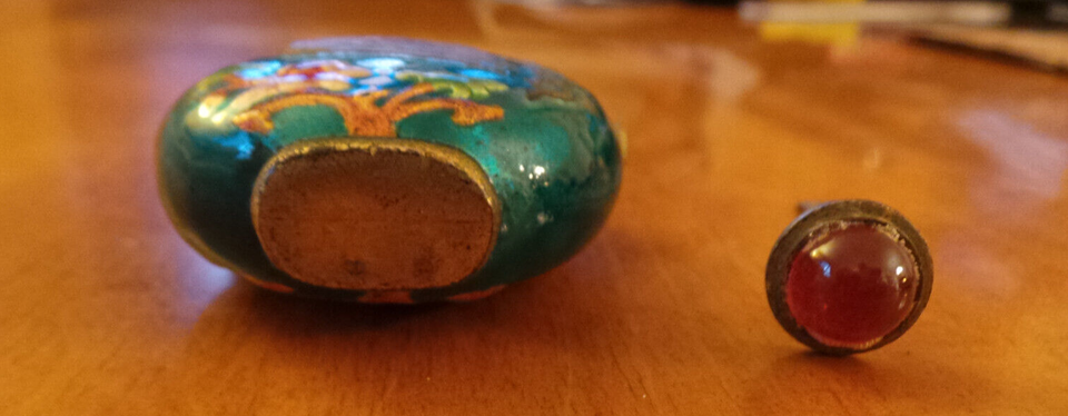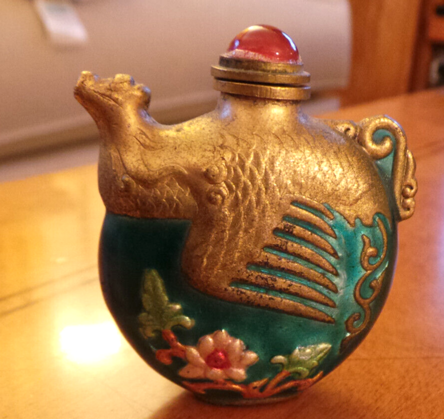 unique Vintage Chinese Bird Snuff Bottle with Stopper, Gold color, Enamel VG+