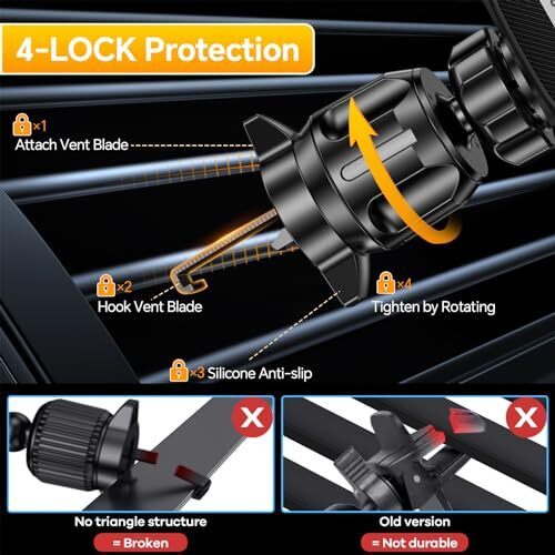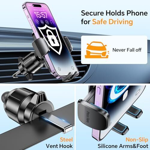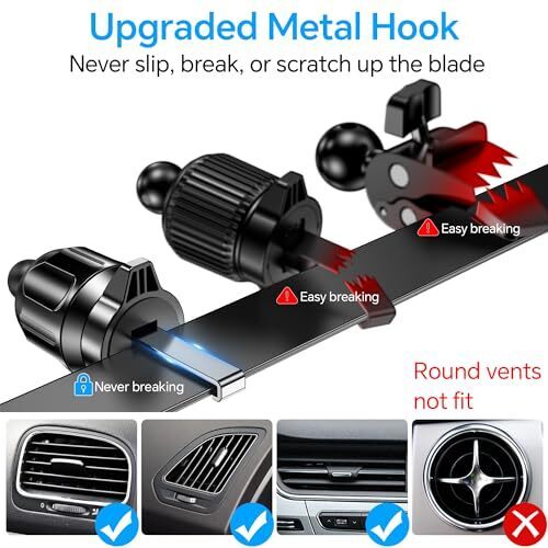 ?Upgraded Metal Hook?: The metal hooks in this phone holder are made of high quality metal, which is significantly better than plastic hooks that break easily. Together with the upgraded locking mechanism, it ensures an ultra-stable connection between the phone mount for car and the vent. to ensure that your phone remains stable and does not fall off even on bumpy roads.