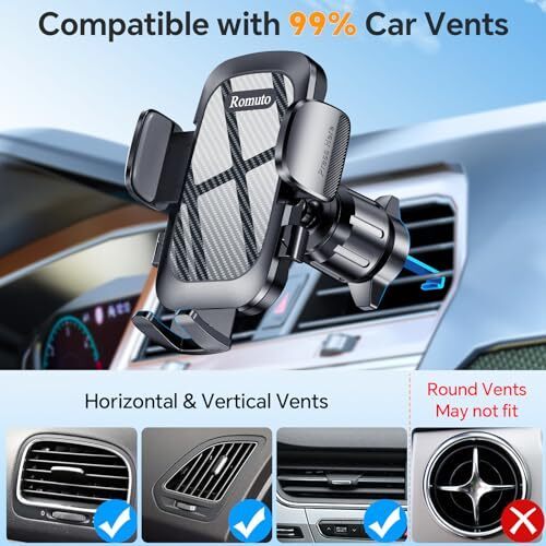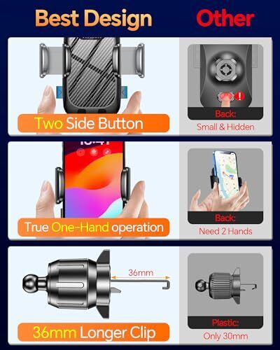 ?Sturdy Car Phone Holder Design?: Cell phone holder mount has a compact design that won't block the vents or damage them. It is compatible with 99% horizontal and vertical vents. The car cell phone holder has a longer built-in metal hook clip than regular hook clips, solving the problem of poor compatibility and easy dislodgement from another car mount with cradle.