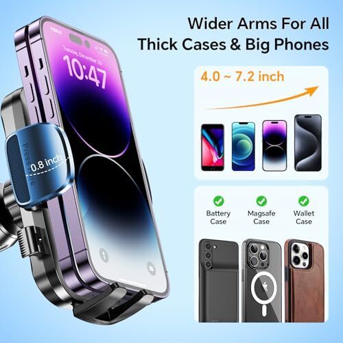 ?Big Phone Thick Case Friendly?: Deeper and wider adjustable clamping arms and adjustable feet are designed to allow our car phone mount to accommodate larger and thicker phones and cases. Fits all 4-7 inch phones such as iPhone 15, 14, 13, 12, Pro, Max/Plus/Mini, Galaxy S22/S21 and more. In addition, Otter box case, Wallet case, Thick case, Mag safe case, etc. are all compatible.