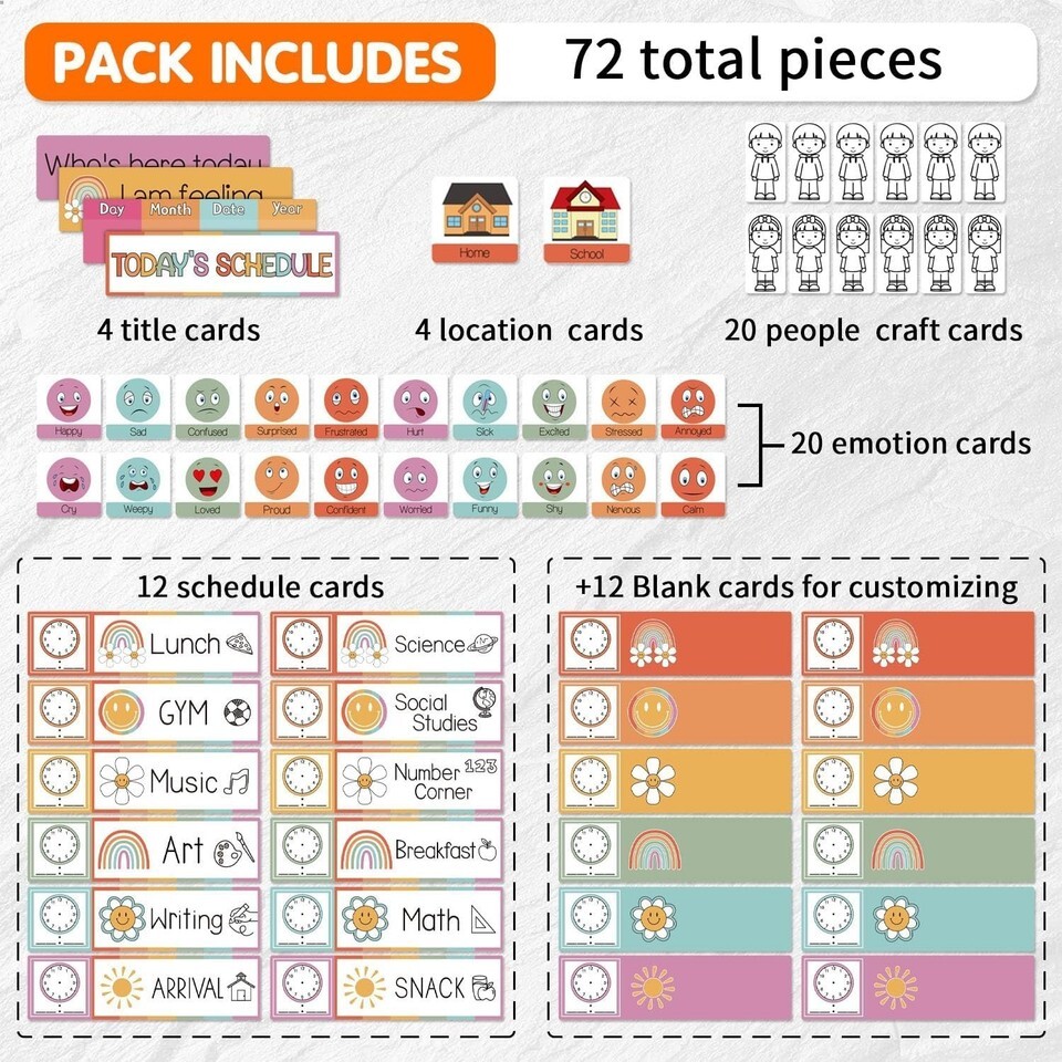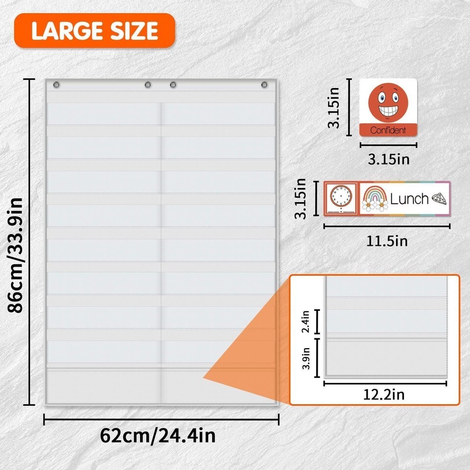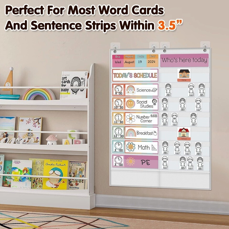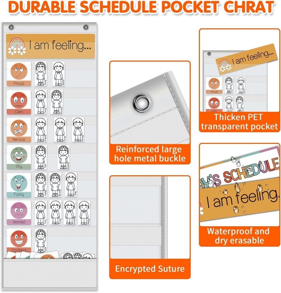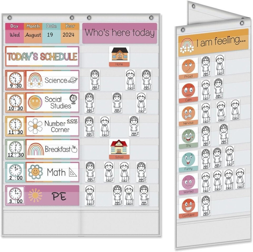 ORGANIZE YOUR DAY: This double-sided, foldable pocket chart makes it easy to clearly outline your daily schedule for students with pockets for each class period or activity. Multifunctional use: Contains schedule cards, attendance cards, mood cards