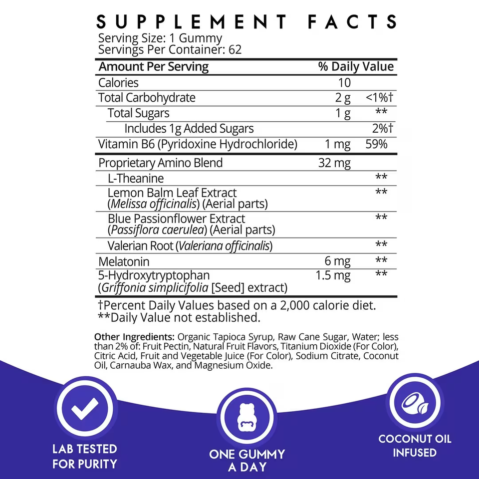Vitamin B6 (as Pyridoxine Hydrochloride) Proprietary Amino Blend* L-Theanine Lemon Balm Leaf Extract (Melissa Officinalis) (Aerial Parts)Passionflower Extract (Passiflora Caerulea) (Aerial Parts) Valerian Root (Valeriana Officinalis) (Root) Melatonin5-Hydroxytryptophan Extract (Seed)