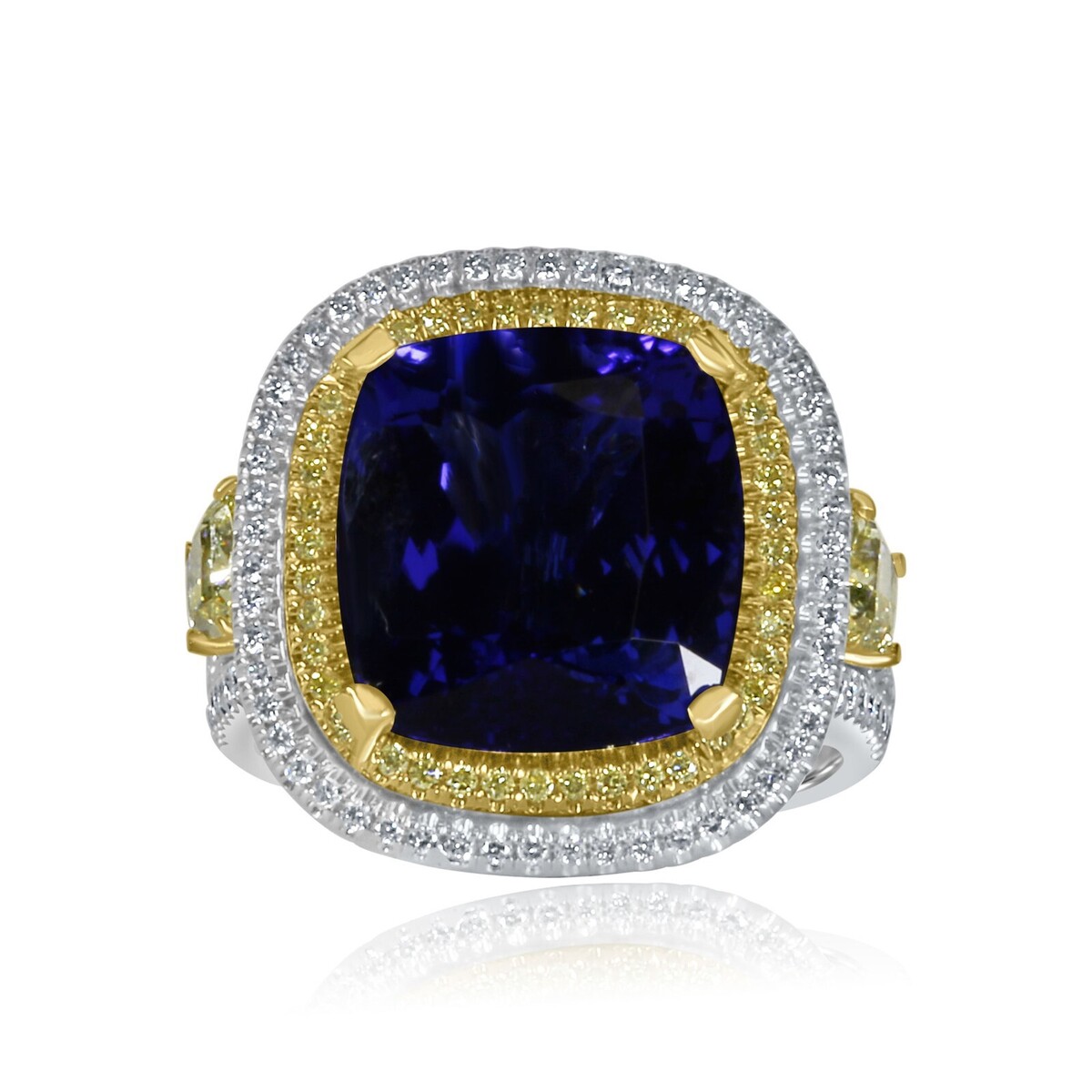 El anillo de compromiso de diseño de Art Deco presenta un tanzanita de corte brillante de color violeta azul certificado de GIA de 8.68 quilates de tanzanita de corte brillante rodeado por un halo doble de diamantes naturales de corte brillante y amarillo de color amarillo en el entorno de micro pavimento. ¡Diamantes adicionales se alinean, el vastago triple dividido con 0.78 quilates 2 cortados con trapezoides diamantes naturales intensos naturales completando la elegancia brillante de este anillo! El anillo esta elaborado con oro de dos tono de 14 quilates que brilla con un acabado alto en polaco. El peso total de quilates es de 10.34 quilates.